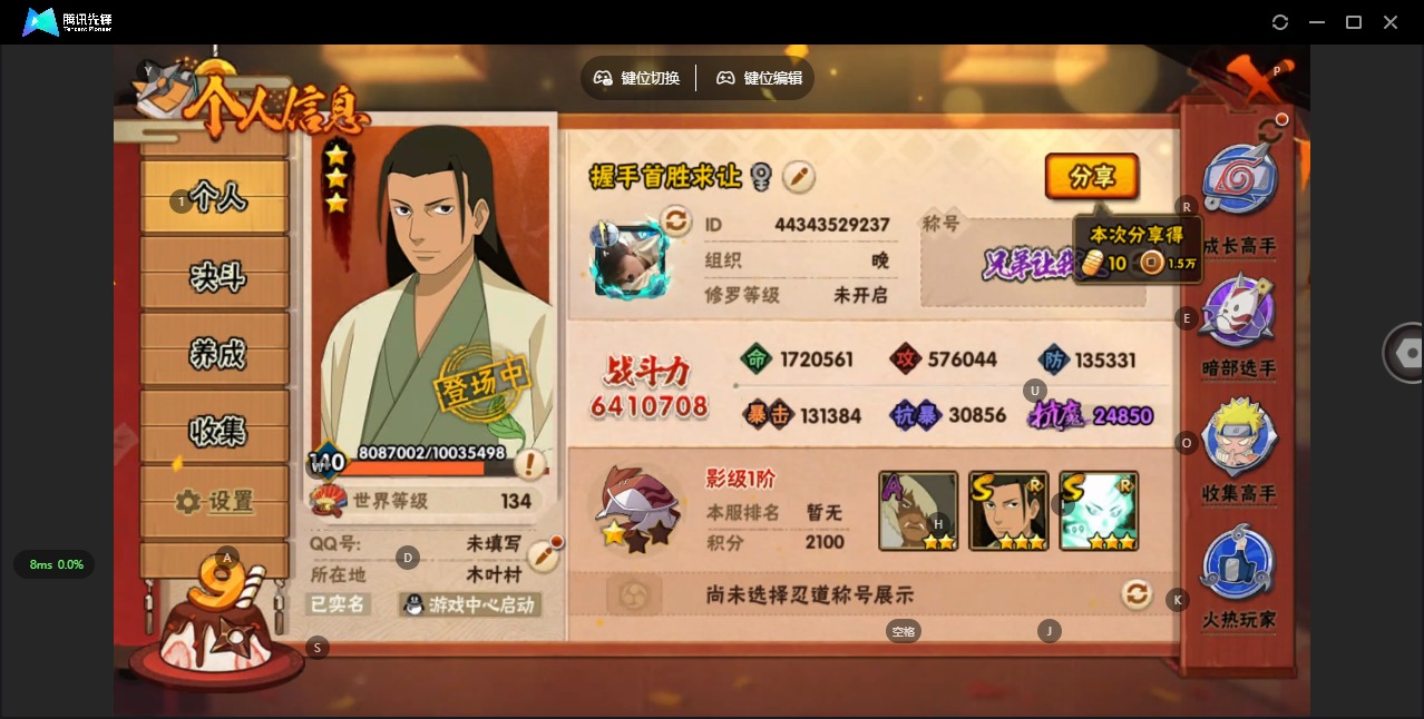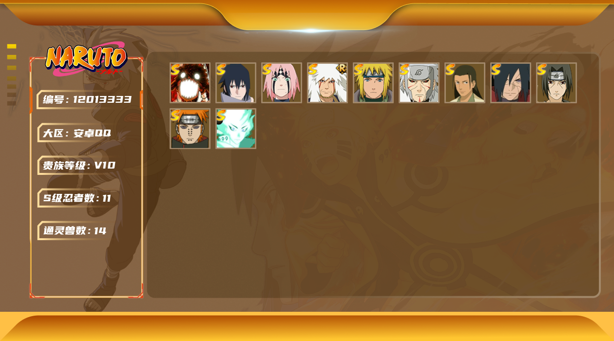 [12013333]V10 11S忍 22A忍 14通灵 641W战力 可二次 可修改实名 优质装备:千手扉间「秽土转生」,春野樱 「忍界大战」,宇智波佐助「永恒万花筒」,千手柱间·木叶创立,宇智波斑「秽土转生·解」,大筒木舍人 「最终章」,漩涡鸣人 「暴怒·第六尾」 S级忍者:自来也 「舞之豪杰」,宇智波鼬 「须佐能乎」,佩恩「天道」,波风水门