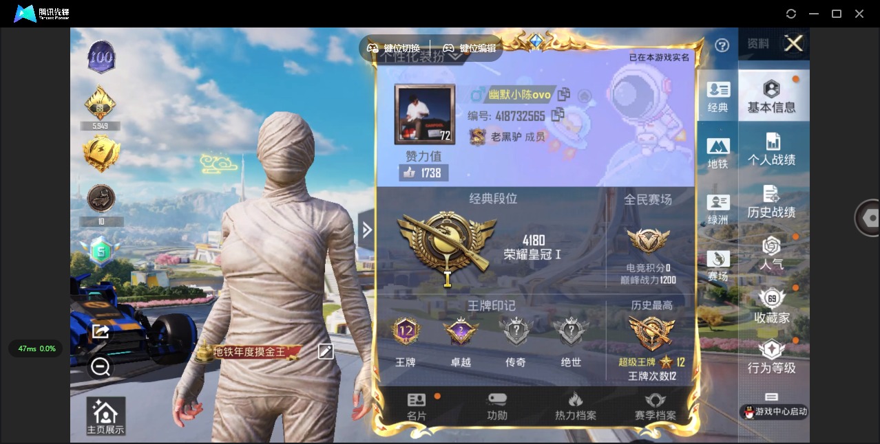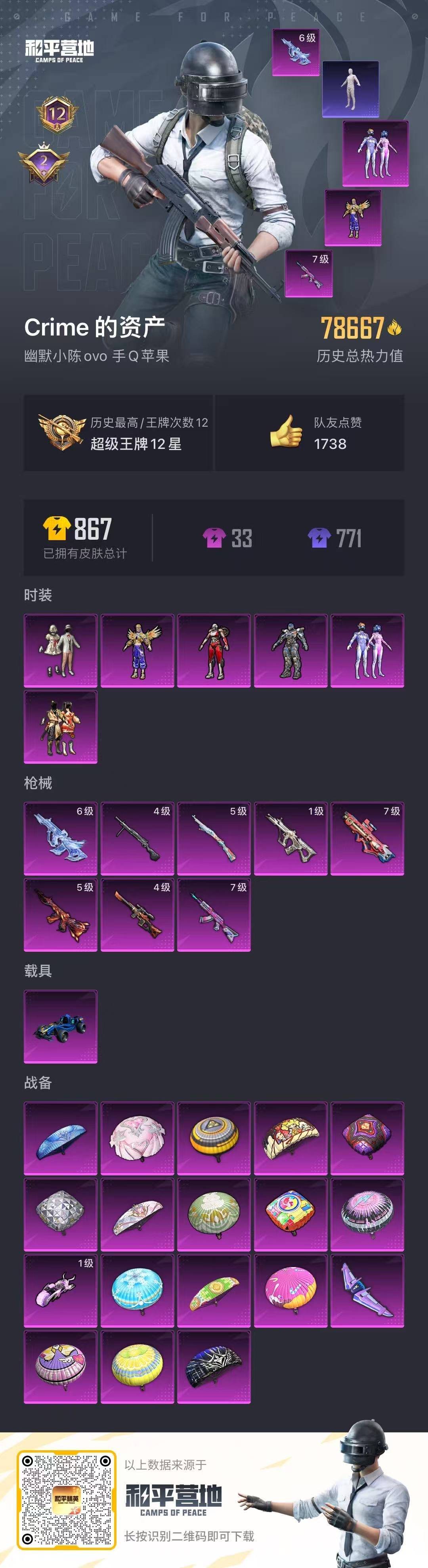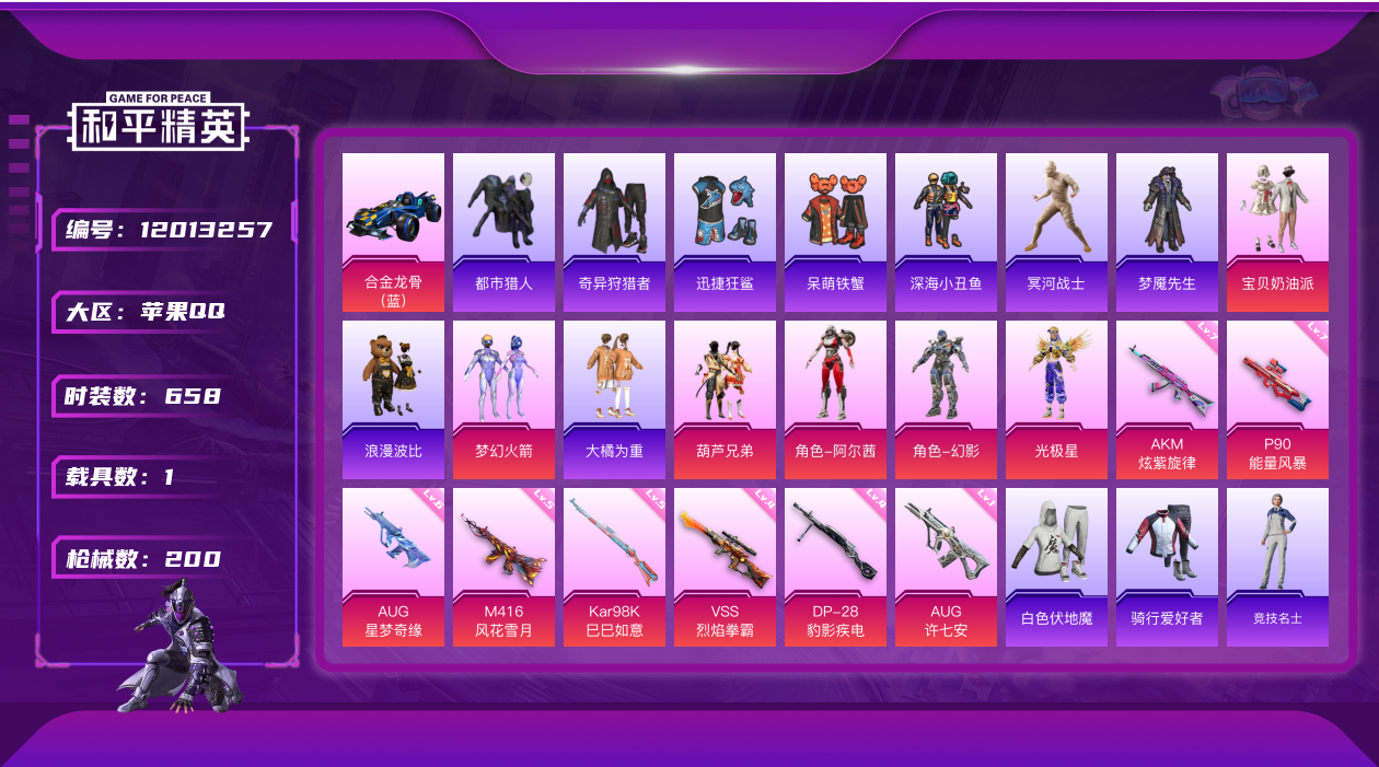 [12013257]6粉装 8特效枪 1载具 12印记 可二次 可修改实名 连体王者 身法装备:都市猎人,冥河战士(老木乃伊),Mark.06(新蓝螳螂),萌熊伴侣背包(粉熊背包) 优质装备:冥河战士(老木乃伊),木乃伊套装(老)(冥河战士),合金龙骨(蓝),都市猎人,萌熊伴侣背包(粉熊背包),AKM炫紫旋律,奇异狩猎者,梦幻火箭(新101)(新火箭少女101粉色套装),宝贝奶油派,VSS烈焰拳霸,M416风花雪月,P90能量风暴,七级P90-能量风暴,七级AKM-炫紫旋律,AUG星梦奇缘,六级AUG-星梦奇缘,AUG-许七安,Kar98K-巳巳如意 热门装扮:葫芦兄弟,阿尔茜,幻影,光极星,大橘为重,迅捷狂鲨,呆萌铁蟹,梦魇先生,深海小丑鱼,浪漫波比,都市猎人 稀有枪皮:DP-28-豹影疾电 五级特效枪:五级Kar98K-巳巳如意,五级M416-风花雪月 四级特效枪:四级DP-28-豹影疾电,四级VSS-烈焰拳霸 一级特效枪:一级AUG-许七安 紫色装扮:SS22特训,SS23特训,SS21特训,SS31特训套装,SS2特训,六六大吉,冰川特警,冷焰舞者,北国孤狼,旭日情侣,SS30特训套装,云朵鹅,雪绒豹,SS33特训套装,青涩时光,灵公主,SS20特训,赛罗奥特曼,SS15特训,捷德奥特曼,SS16特训,银白舞王,SS13特训,治愈之星,科技之星,SS14特训,萌趣颜团子,特种颜团子,飞驰魅影,音速流光,SS19特训,吉莉礼服,瑞龙福将,团圆交子,SS17特训,炫光向阳,异彩先驱,SS18特训,都市魅力,酒红色名流,金鼠迎春,长空猛禽,霓虹极客,霓虹街区,缤纷果语,耀眼新星,蓝彩潮人,蓝色守护者,虎虎生威吉莉,街头潮人,跃动心情,风行保卫者,飞行日记,骑行爱好者,魅力单车,黄色名流,龙的传人,冰河战士,龙魂突击队,蝶变,香桃花海,极速红龙,柠萌假日,格斗先锋,沙漠兵团,海岛探路者,深蓝色名流,幻影武者,坚韧舞者,夏日音浪,夜莺强袭者,完美偶像,帅气教官,战地督导,战地菁英,探宝勇士,湖蓝色名流,绮丽涂鸦,疯狂小兔子,白色伏地魔,破晓战魂,破蛋小黄鸡,福星高照,空投萌叽,竞技勇士朋克,竞技达人朋克,王牌教练,潮流先锋,牛气冲天,灰色守护者,灼焰舞者,炫蓝之夏,热血青春,牛气满满,猛禽,特战装甲,镭射皇者,小熊娃娃,雏菊兔兔,萝兰蝴蝶,SS29特训,白光莹,纯真浪花,热情海星,