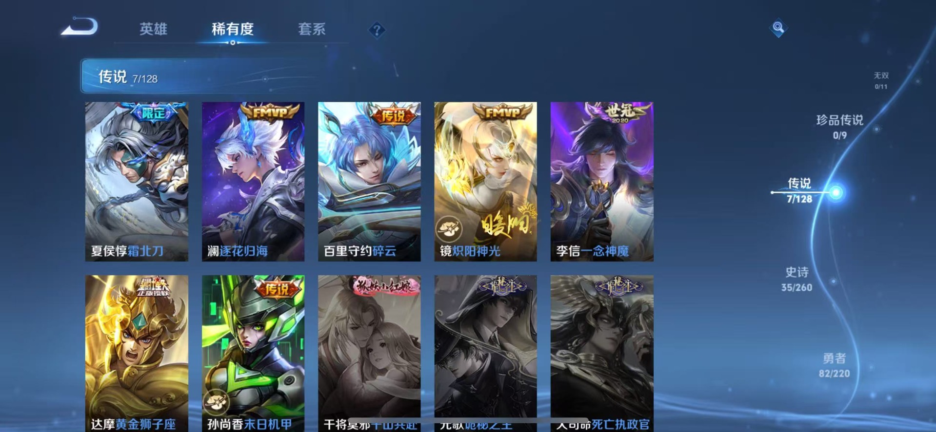 - PX_2111775-Q/绝世王者/182皮肤/121英雄/0典藏/0珍品无双/1无双/3珍品传说/14传说/47史诗/5稀有英雄 【3 珍品传说】朽木白哉 暃,黑崎一护 宫本武藏,怪盗基德 马可波罗, 【1 无双皮肤】器灵·螭龙剑 曜, 【14 传说皮肤】启明星使 虞姬,曦玄引 吕布,无尽星芒 后羿,时之奇旅 鲁班七号,时之恋人 刘备,淬星耀世 赵云,妄想实况 马可波罗,金乌负日 海月,愿照·九