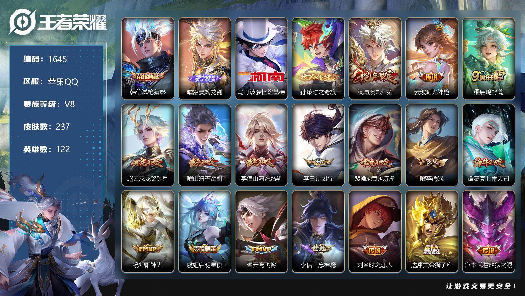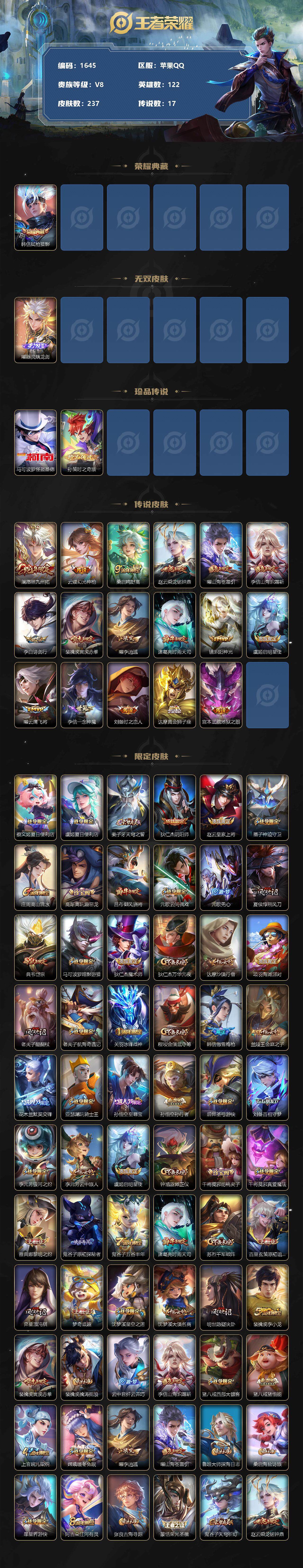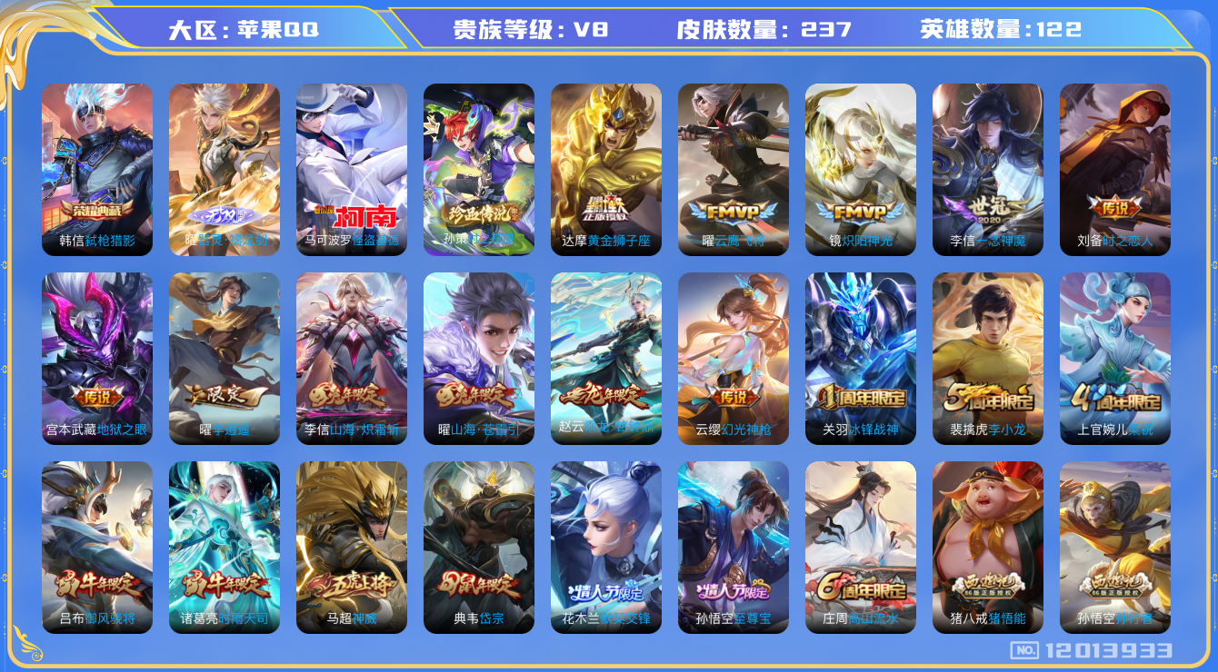 [12013933]【商品标题】:苹果Q-V2-永恒钻石III段位-122英雄-237皮肤-1典藏-0珍品无双-1无双-2珍品传说-17传说-70史诗