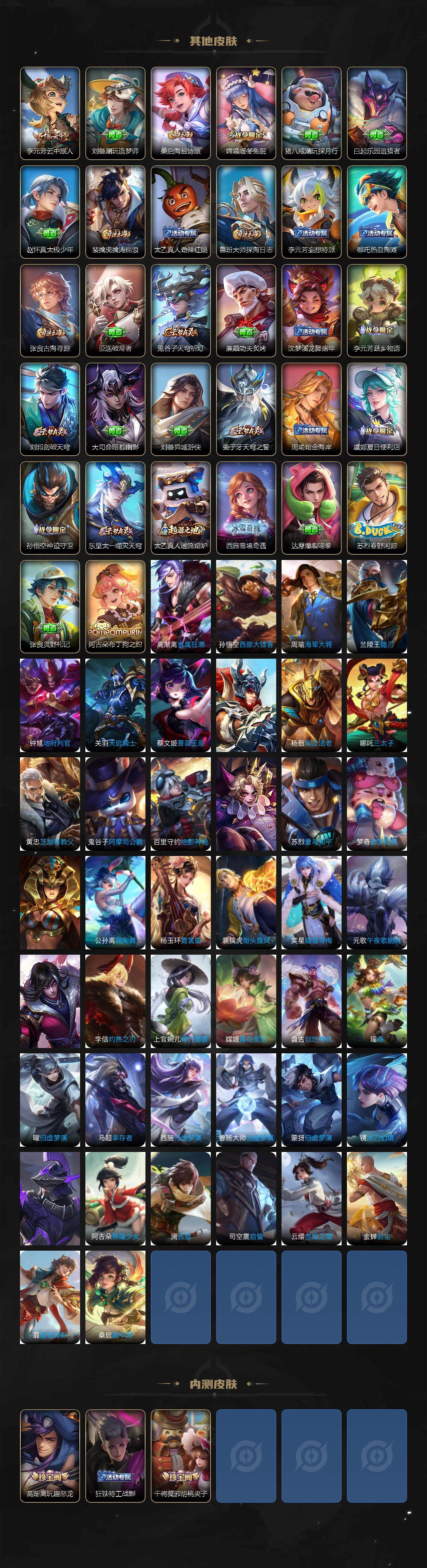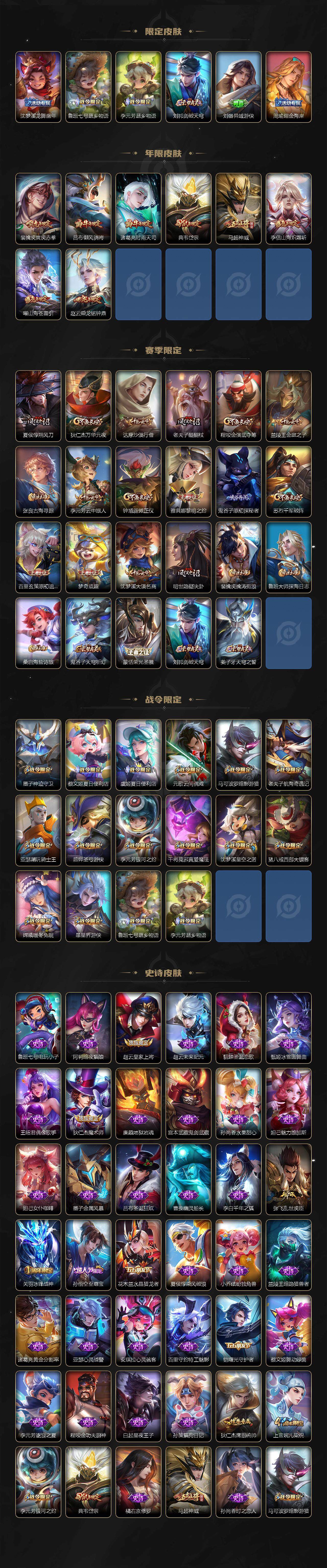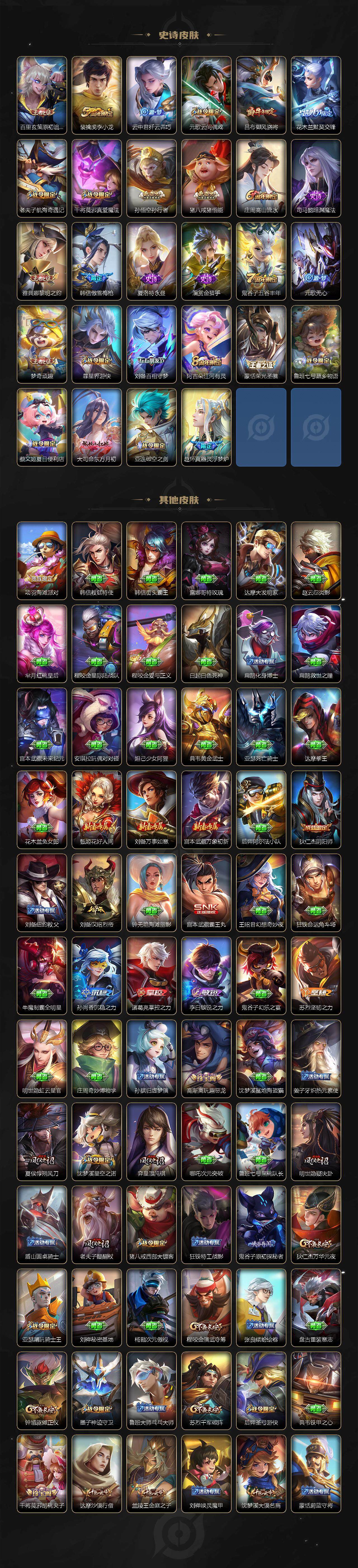 【限定皮肤】:蔡文姬夏日便利店,虞姬夏日便利店,姜子牙天穹之誓,狄仁杰阴阳师,赵云皇家上将,墨子神迹守卫,庄周高山流水,高渐离玩趣恶龙,吕布御风骁将,元歌云间偶戏,元歌无心,夏侯惇朔风刀,典韦岱宗,马可波罗暗影游猎,狄仁杰魔术师,狄仁杰万华元夜,达摩沙漠行僧,项羽海滩派对,老夫子醍醐杖,老夫子航海奇遇记,关羽冰锋战神,程咬金演武夺筹,韩信傲雪梅枪,兰陵王金庭之子,花木兰默契交锋,亚瑟潮玩骑士王,孙悟空至尊宝,孙悟空孙行者,后羿圣弓游侠,刘备百相守梦,李元芳银河之约,李元芳云中旅人,虞姬启明星使,钟馗驱傩正仪,干将莫邪胡桃夹子,干将莫邪真爱魔法,雅典娜黎明之约,鬼谷子原初探秘者,鬼谷子五谷丰年,诸葛亮时雨天司,苏烈千军破阵,百里玄策原初追逐者,弈星混沌棋,梦奇顽趣,沈梦溪星空之诺,沈梦溪大漠名商,明世隐疑决卦,裴擒虎李小龙,裴擒虎寅虎赤拳,裴擒虎擒涛扼浪,云中君纤云弄巧,李信山海炽霜斩,猪八戒西部大镖客,猪八戒猪悟能,上官婉儿梁祝,嫦娥暖冬兔眠,曜李逍遥 ,曜山海苍雷引,鲁班大师探海日志,桑启海盐诗旅,暃星界游侠,阿古朵江河有灵,张良古海寻踪,蒙恬荣光圣徽,鬼谷子天穹祈灯,赵云乘龙铭钟鼎,沈梦溪龙舞盛年,鲁班七号蔬乡物语,李元芳蔬乡物语,刘邦剑破天穹,刘备异域游侠,周瑜熔金海岸