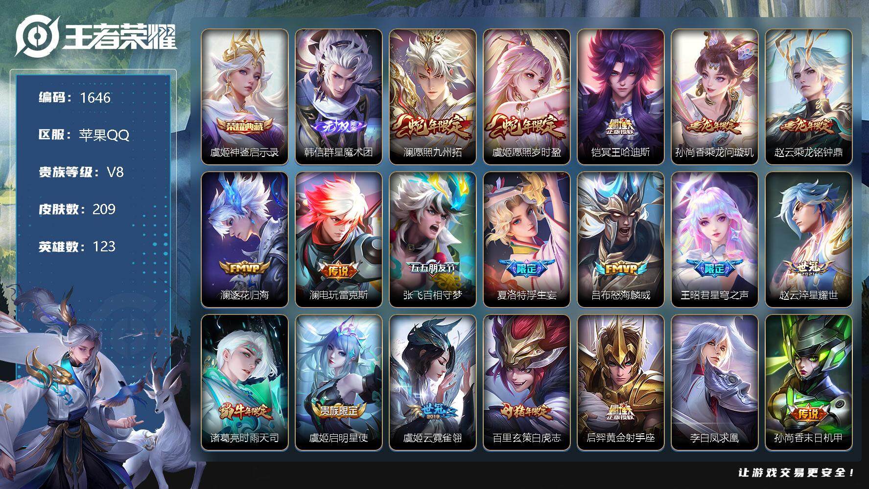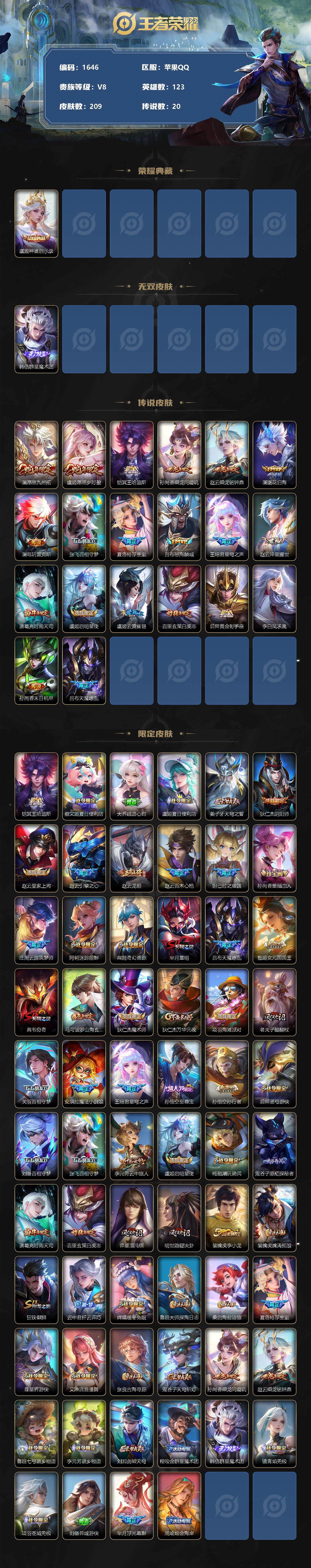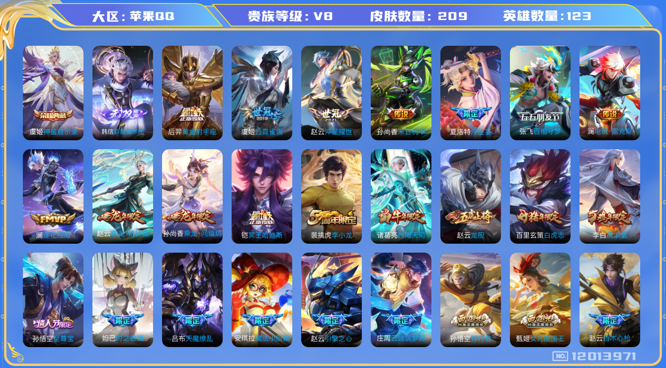 [12013971]【商品标题】:苹果Q-V7-最强王者段位-123英雄-209皮肤-1典藏-0珍品无双-1无双-0珍品传说-20传说-60史诗
