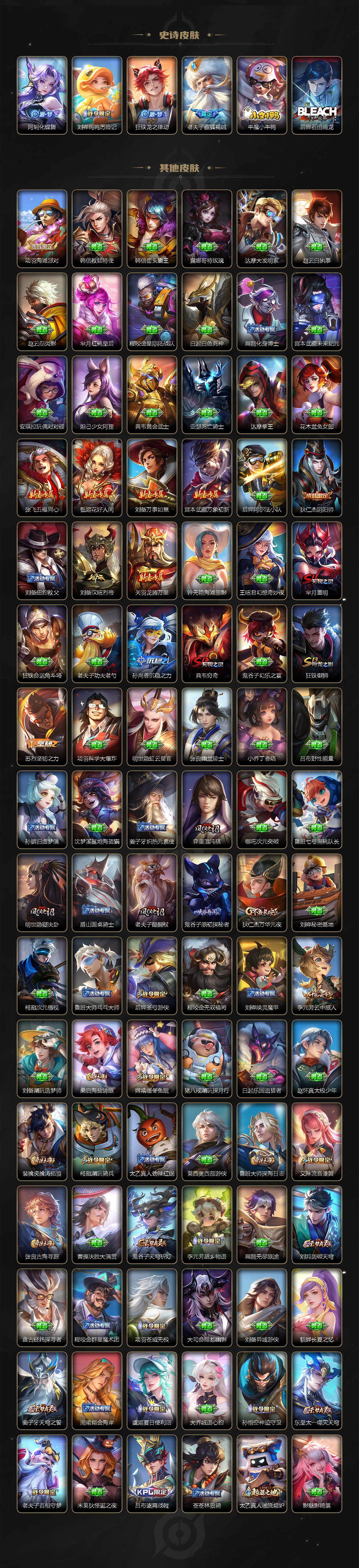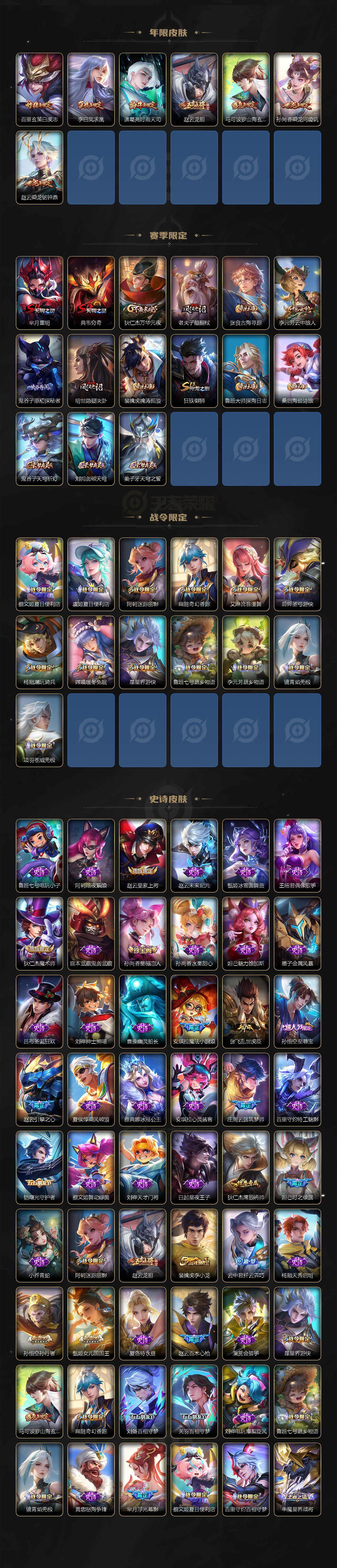【限定皮肤】:铠冥王哈迪斯,蔡文姬夏日便利店,大乔绒语心约,虞姬夏日便利店,姜子牙天穹之誓,狄仁杰阴阳师,赵云皇家上将,赵云引擎之心,赵云龙胆,赵云百木心枪,妲己时之彼端,孙尚香蔷薇恋人,庄周云端筑梦师,阿轲迷踪丽影,扁鹊奇幻香踪,芈月重明,吕布天魔缭乱,甄姬女儿国国王,典韦穷奇,马可波罗山海玄木吟,狄仁杰魔术师,狄仁杰万华元夜,项羽海滩派对,老夫子醍醐杖,关羽百相守梦,安琪拉魔法小厨娘,王昭君星穹之声,孙悟空至尊宝,孙悟空孙行者,后羿圣弓游侠,刘备百相守梦,张飞百相守梦,李元芳云中旅人,虞姬启明星使,杨戬潮玩骑兵,鬼谷子原初探秘者,诸葛亮时雨天司,百里玄策白虎志,弈星混沌棋,明世隐疑决卦,裴擒虎李小龙,裴擒虎擒涛扼浪,狂铁御狮,云中君纤云弄巧,嫦娥暖冬兔眠,鲁班大师探海日志,桑启海盐诗旅,夏洛特浮生妄,暃星界游侠,艾琳流音漫舞,张良古海寻踪,鬼谷子天穹祈灯,孙尚香乘龙问璇玑,赵云乘龙铭钟鼎,鲁班七号蔬乡物语,李元芳蔬乡物语,刘邦剑破天穹,程咬金群星魔术团,韩信群星魔术团,镜青焰无极,项羽苍威无极,刘备异域游侠,芈月浮光幕影,周瑜熔金海岸