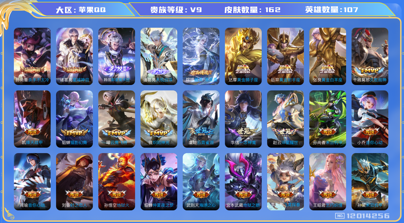 [12014256]【商品标题】:苹果Q-V9-最强王者段位-107英雄-162皮肤-2典藏-0珍品无双-2无双-1珍品传说-34传说-49史诗