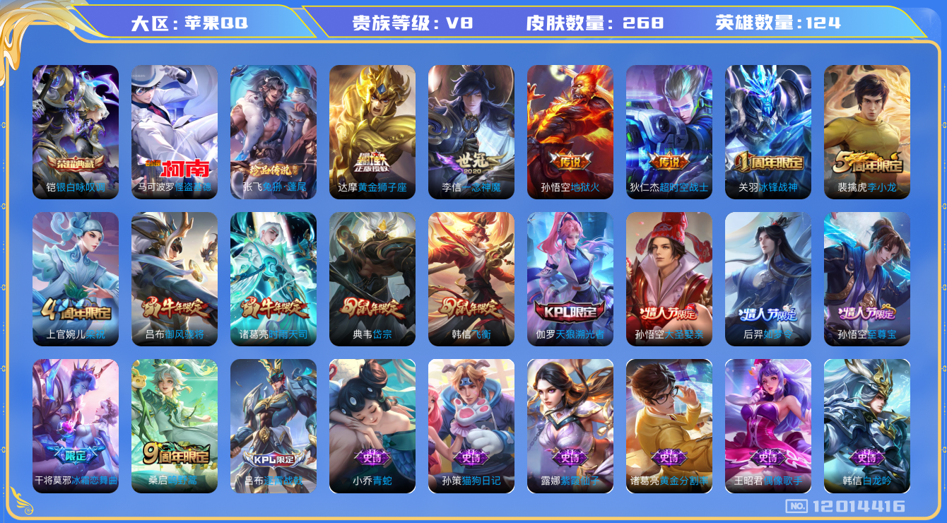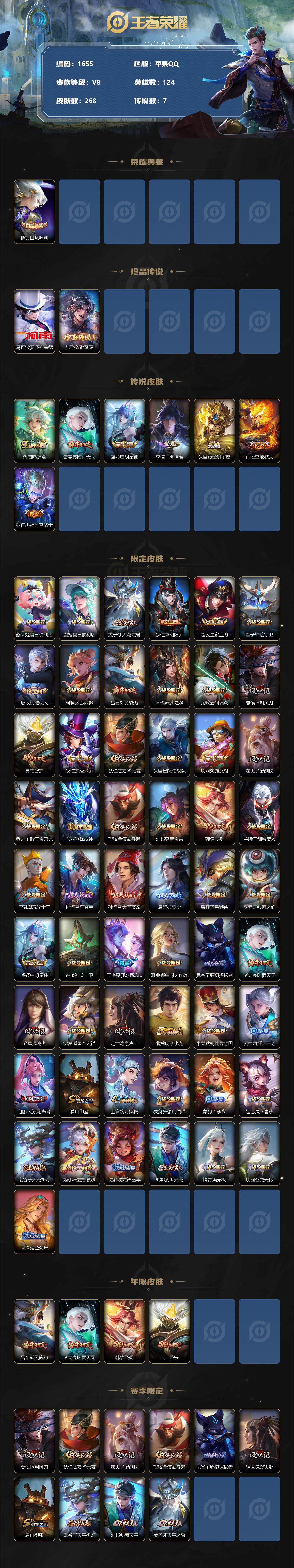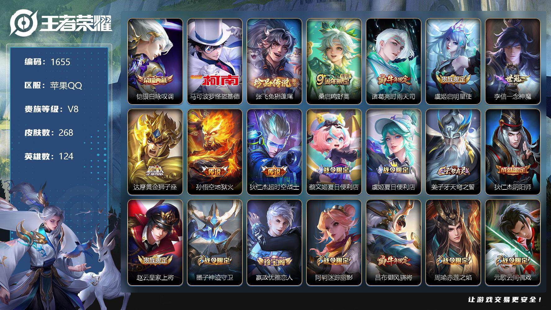[12014416]【商品标题】:苹果Q-V8-最强王者段位-124英雄-268皮肤-1典藏-0珍品无双-0无双-2珍品传说-7传说-75史诗