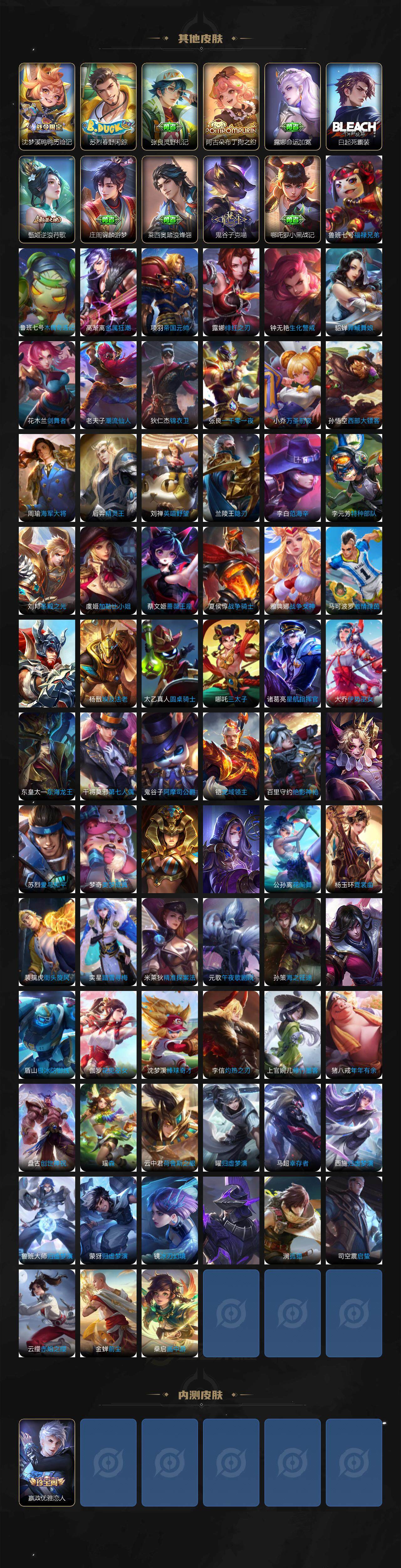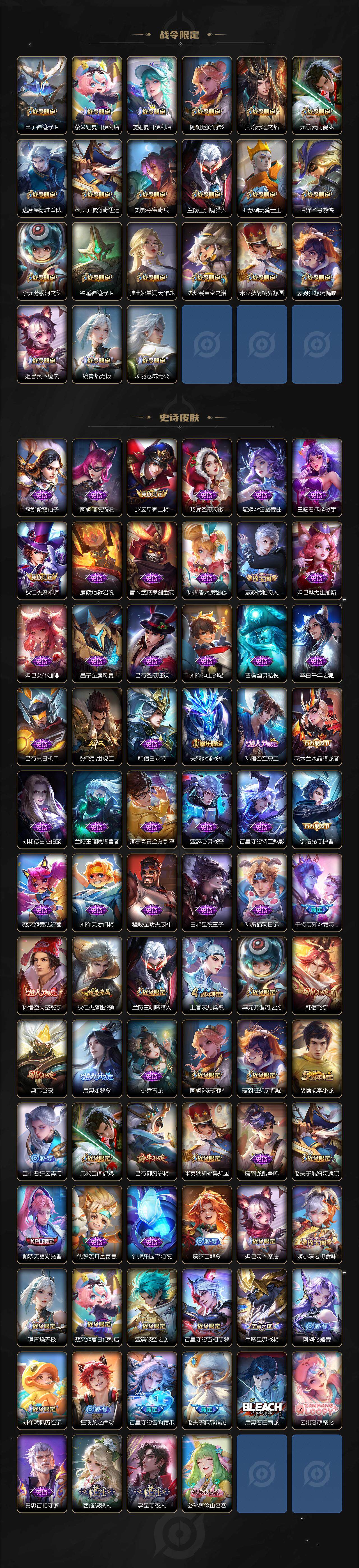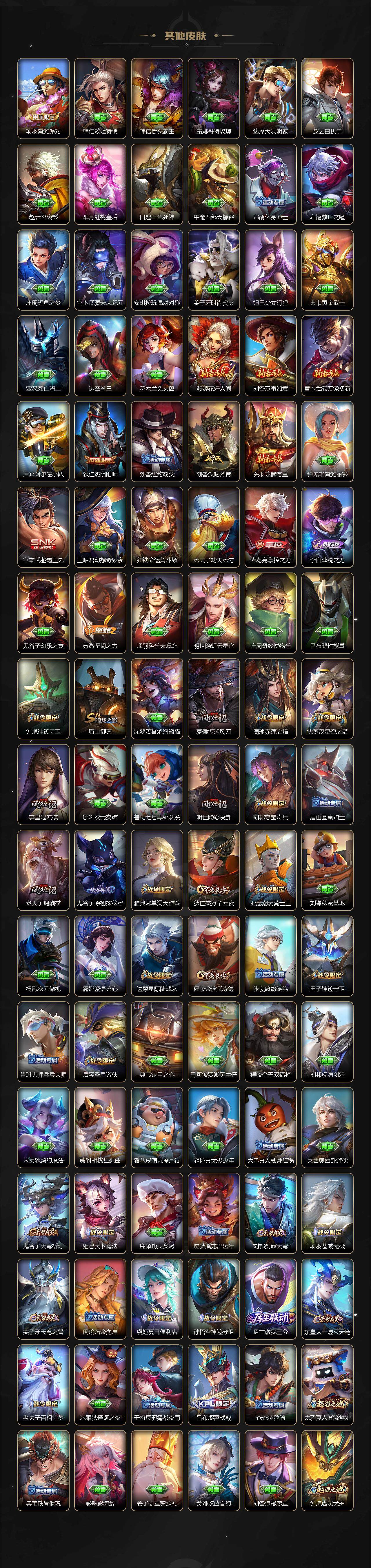 【限定皮肤】:蔡文姬夏日便利店,虞姬夏日便利店,姜子牙天穹之誓,狄仁杰阴阳师,赵云皇家上将,墨子神迹守卫,嬴政优雅恋人,阿轲迷踪丽影,吕布御风骁将,周瑜赤莲之焰,元歌云间偶戏,夏侯惇朔风刀,典韦岱宗,狄仁杰魔术师,狄仁杰万华元夜,达摩星际陆战队,项羽海滩派对,老夫子醍醐杖,老夫子航海奇遇记,关羽冰锋战神,程咬金演武夺筹,刘邦夺宝奇兵,韩信飞衡,兰陵王驯魔猎人,亚瑟潮玩骑士王,孙悟空至尊宝,孙悟空大圣娶亲,后羿如梦令,后羿圣弓游侠,李元芳银河之约,虞姬启明星使,钟馗神迹守卫,干将莫邪冰霜恋舞曲,雅典娜单词大作战,鬼谷子原初探秘者,诸葛亮时雨天司,弈星混沌棋,沈梦溪星空之诺,明世隐疑决卦,裴擒虎李小龙,米莱狄胡桃异想国,云中君纤云弄巧,伽罗天狼溯光者,盾山御銮,上官婉儿梁祝,蒙犽狂想玩偶喵,蒙犽百解令,妲己灵卜魔法,鬼谷子天穹祈灯,姬小满妄想食味,沈梦溪龙舞盛年,刘邦剑破天穹,镜青焰无极,项羽苍威无极,周瑜熔金海岸