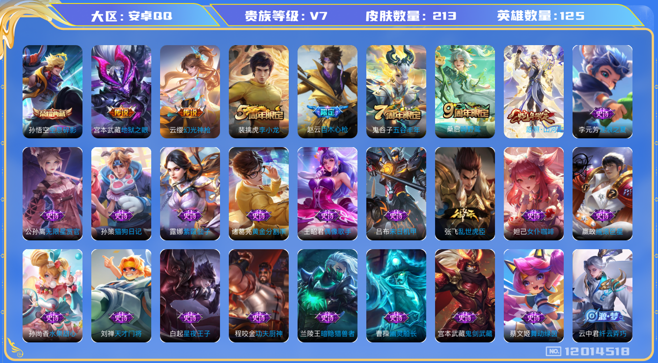 [12014518]【商品标题】:安卓Q-V5-永恒钻石I段位-125英雄-213皮肤-1典藏-0珍品无双-0无双-0珍品传说-4传说-60史诗