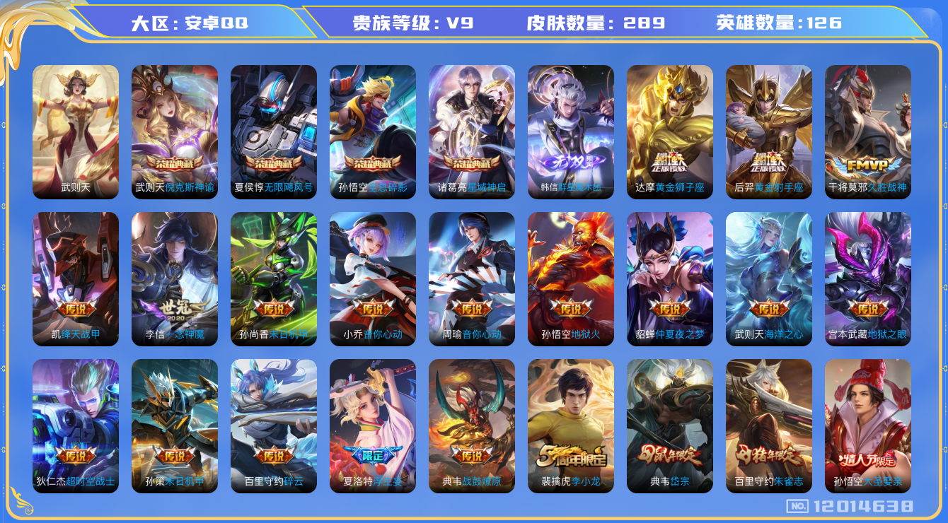 [12014638]【商品标题】:安卓Q-V9-最强王者段位-126英雄-289皮肤-4典藏-0珍品无双-1无双-0珍品传说-18传说-71史诗