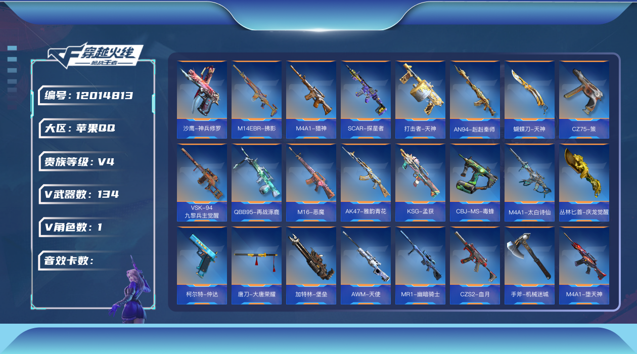 [12014813]V4 134英雄武器 1英雄角色 可二次 可修改实名 优质装备:TAC-慈,M4A1-仲达,王者之影,M200-幻神,CZ75-策,CZS2-仲康 v武器:沙鹰-神兵修罗,M14EBR-拂影,M4A1-猎神,SCAR-探星者,打击者-天神,AN94-赳赳秦师,蝴蝶刀-天神,VSK-94-九黎兵主觉醒,QBB95-再战涿鹿,M16-恶魔,AK47-雅韵青花,KSG-孟获,CBJ-MS-毒蜂,M4A1-太白诗仙,丛林匕首-庆龙觉醒,柯尔特-仲达,唐刀-大唐荣耀,加特林-堡垒,AWM-天使,MR1-幽暗骑士,CZS2-血月,手斧-机械迷城,M4A1-堕天神,QSZ92-冰魂觉醒,MAC-10-孟获,烈焰刀,烈焰弓,G3A3-衍神兵,M14EBR-葫芦山庄,QBZ97-浩瀚征途,DDM4-PDW-星际宇航觉醒,环刃-炫光掠影觉醒,王者之誉,AWM-大湾溢彩,双持沙鹰-元让,沙鹰-宇航兔兔,气勇胆烈戟,AWM-指南针,AWM-指南针觉醒,AK47-木兰,左轮-卧龙觉醒,甩棍-卧龙觉醒,SCAR-心动PICK,破邪蛇棍觉醒,GLOCK18-猎神,马来剑-耀金伯爵,女皇利刃-铁胆虎魄,龙爪手-鼓龙,蟒蛇-鼓龙,AK47-火麒麟,M4A1-雷神,AK47-无影,M4A1-黑骑士,AK12-天启,剑齿虎-炫彩,加特林-炼狱,AWM-天龙,巴雷特-毁灭,巴雷特-极光,98K-黑骑士,AK47-猩红传说,AK47-燎天净火,M4A1-赛博雷神,AK47-血武士,M4A1-海骑士,MK47-云舞,SCAR-幽暗骑士觉醒,QBZ03-金色蔷薇,AK47-黑鲨,QBZ03-死神,M4A1-破空冰刃,M4A1-心动次元觉醒,神罚战斧,马来剑-毁灭,屠龙,地狱火,汤姆逊-烈龙,双持斯泰尔-天使,沙鹰-修罗,USP-神罚,沙鹰-天神 王者武器:王者之霆