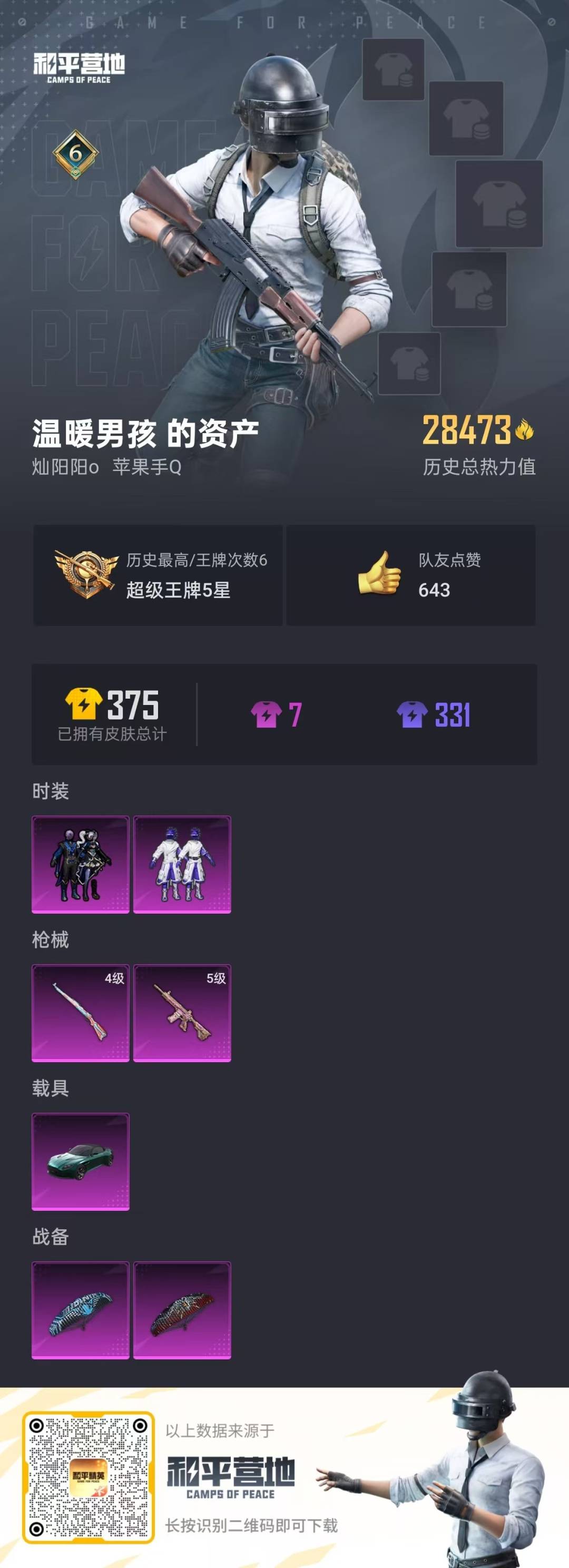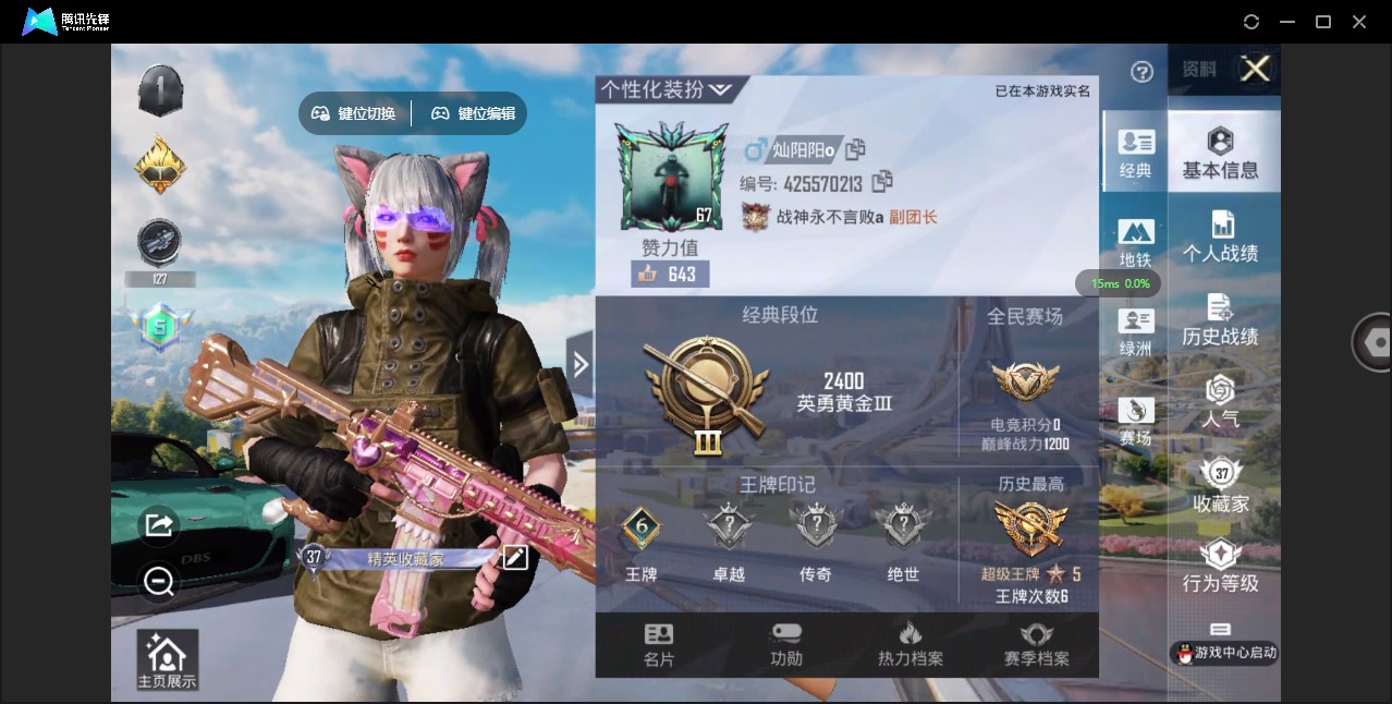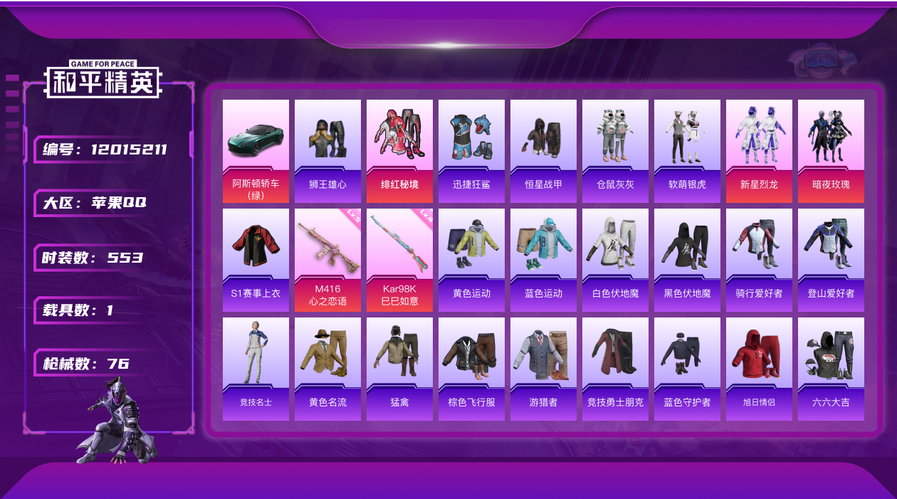 [12015211]2粉装 2特效枪 1载具 6印记 可二次 可修改实名 优质装备:阿斯顿·马丁DBS(绿),M416心之恋语,新星烈龙(小白龙),Kar98K-巳巳如意 热门装扮:暗夜玫瑰,S1赛事上衣,软萌银虎,仓鼠灰灰,狮王雄心,恒星战甲,迅捷狂鲨,绯红秘境 五级特效枪:五级M416-心之恋语 四级特效枪:四级Kar98K-巳巳如意 紫色装扮:SS31特训套装,S6赛事,SS2特训,SS5特训,云霄猎人,人气偶像,六六大吉,冰川特警,决胜时刻,冷焰舞者,凛冬战士,北国孤狼,S5赛事,旭日情侣,5.56爱好者,SS13特训,SS14特训,都市漫游者,野性战魂,金鼠迎春,雪山征服者,雪山精英,霓虹街区,迎春赐吉,风暴特警,耀动青春,耀眼新星,荣耀,蓝色守护者,蓝色运动,街头潮人,超能勇士,跃动心情,龙腾端午,骑行爱好者,魅力单车,黄色名流,黄色运动,黑色伏地魔,熔岩游骑兵连帽夹克,沙漠毒蛇,极地朋克,棕色飞行服,暗金炫舞,海滨突袭者,滨海假日,幻影武者,圣诞大吉,夜莺强袭者,怒火燎原,战地名士,战地菁英,滨海厨神,绮丽涂鸦,疯狂小兔子,登山爱好者,白熊同盟,白色伏地魔,神秘领域,甜蜜告白,游猎者,福星高照,突袭者,竞技勇士朋克,潮流先锋,牛气冲天,灰色格斗者,热血骑手,熔岩使者,牛气满满,猛禽,特战英豪,特战装甲,特殊使命,特训学院,狂沙舞者,竞技名士,浪漫天命,精神漫游,炽焰拳师,格斗专家,SS6特训,黑色刀锋,核芯基因,SS7特训,拳皇97草薙京,火舞潮人,淡雅花蕊,太极红客,裁决冥王,SS8特训,原初圣火,逆风勇士,SS12特训,SS9特训,机械英豪,机械征服者,SS11特训,春日漫步,SS32特训服(SS32特训套装),萌黄之夏,恋语绒绒,金耀舞者,蓝调潮人,贵族骑装,绯红秘境,冰原奔狼,幻影公爵,忍者信条,丛林猎人,传奇侦探,半糖蓝莓,海上生明月 优质战备:凝视深渊降落伞,银河战甲降落伞