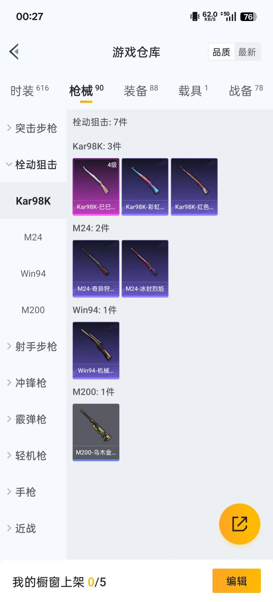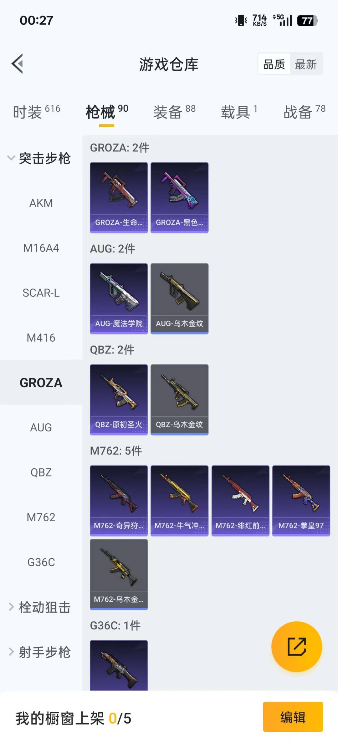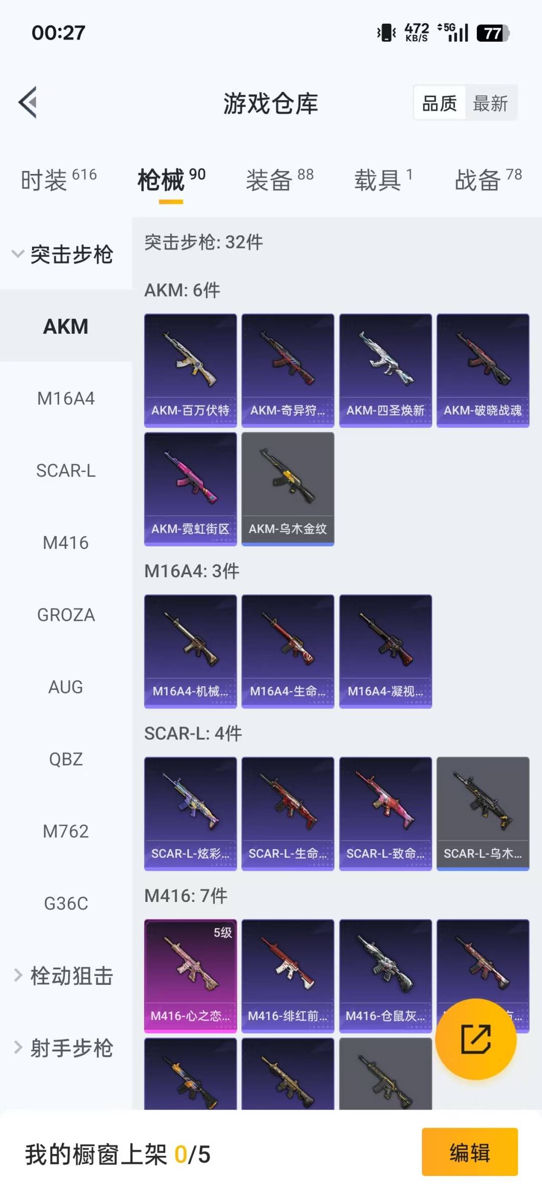 AKM-奇异狩猎者,AKM-百万伏特,M416-仓鼠灰灰,AUG-魔法学院,M762-奇异狩猎者,M24-奇异狩猎者,S686-奇异狩猎者