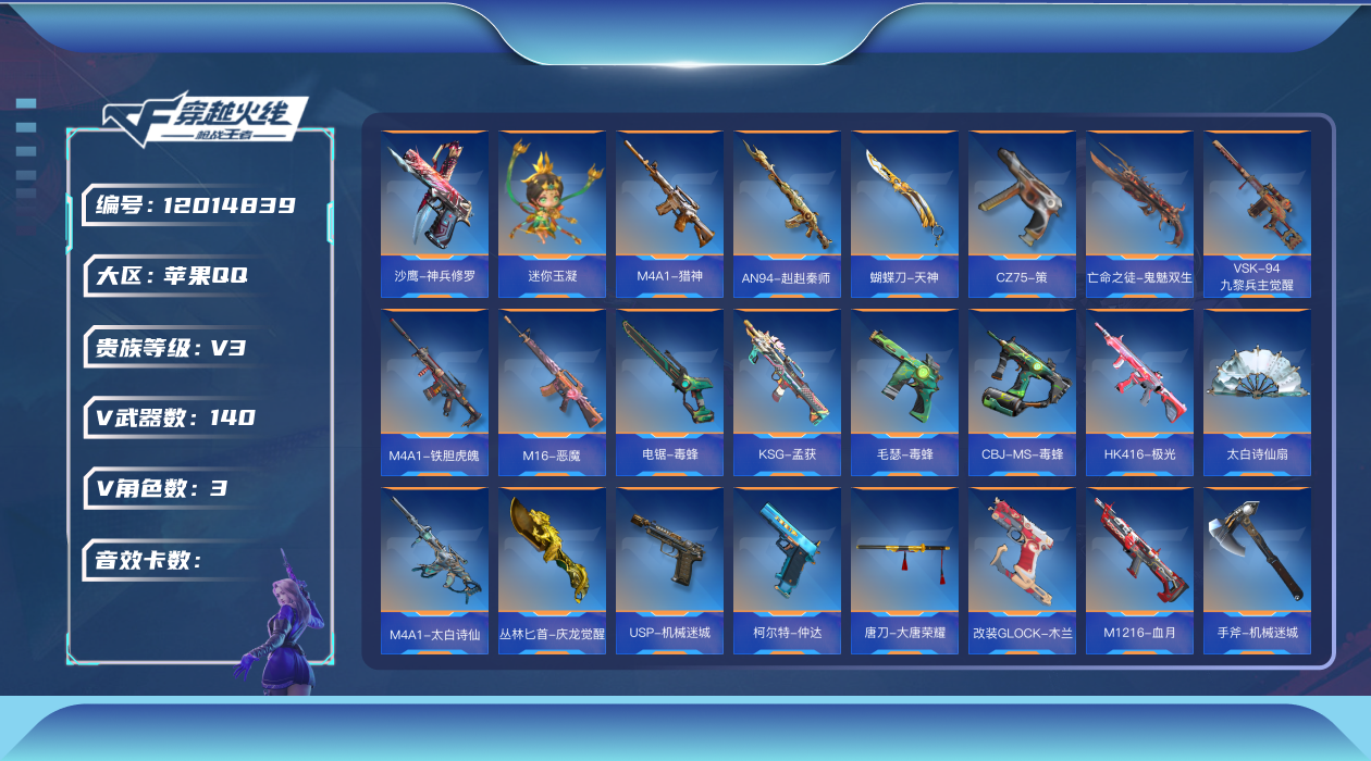 [12014839]V3 1王者武器 140英雄武器 3英雄角色 可二次 可修改实名 优质装备:M200-幻神,CZ75-策 v武器:沙鹰-神兵修罗,迷你玉凝,M4A1-猎神,AN94-赳赳秦师,蝴蝶刀-天神,亡命之徒-鬼魅双生,VSK-94-九黎兵主觉醒,M4A1-铁胆虎魄,M16-恶魔,电锯-毒蜂,KSG-孟获,毛瑟-毒蜂,CBJ-MS-毒蜂,HK416-极光,太白诗仙扇,M4A1-太白诗仙,丛林匕首-庆龙觉醒,USP-机械迷城,柯尔特-仲达,唐刀-大唐荣耀,改装GLOCK-木兰,M1216-血月,手斧-机械迷城,QSZ92-冰魂觉醒,MAC-10-孟获,烈焰刀,烈焰弓,HK417-炎龙铠甲,猎弩-虫族女王,AWM-大湾溢彩,巴雷特-朱雀,双持沙鹰-元让,沙鹰-宇航兔兔,气勇胆烈戟,AWM-指南针觉醒,HK417-朱雀,USP-神工天巧,M4A1-神工天巧,AK47-木兰,左轮-卧龙觉醒,甩棍-卧龙觉醒,SCAR-心动PICK,破邪蛇棍觉醒,GLOCK18-猎神,马来剑-耀金伯爵,清刚-觉醒,女皇利刃-铁胆虎魄,龙鳞-觉醒,AK47-火麒麟,M4A1-雷神,M4A1-黑骑士,MR1-龙吟惊沧海,AK12-天启,暗杀神,AWM-天龙,巴雷特-毁灭,巴雷特-极光,巴雷特-雷神,AWM-裁决,AK47-血武士,QBZ19-天使,蝴蝶刀-极光,M4A1-心动次元,QBZ03-金色蔷薇,神罚战斧,马来剑-毁灭,AK47-华夏传说,屠龙,地狱火,嗜血金鲨,地狱烈炎,AA12-雷神,寒霜烈龙,双持斯泰尔-天使,沙鹰-修罗,USP-神罚,双持柯尔特-极光,蟒蛇-妙才