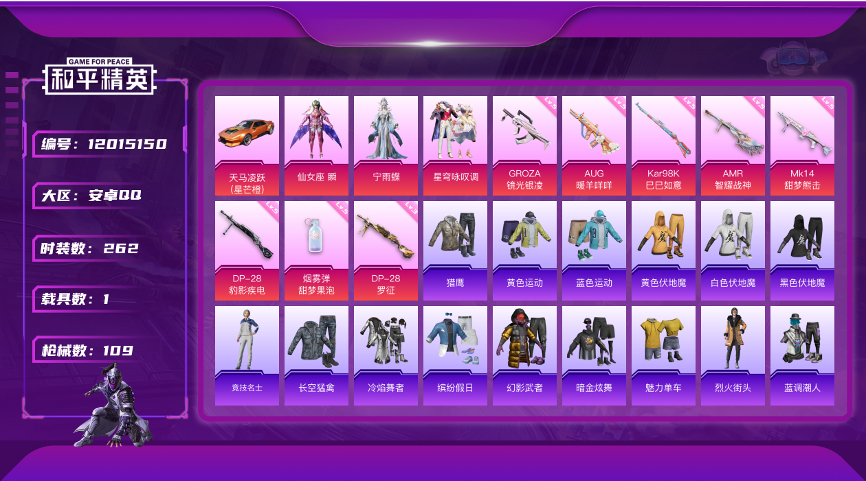 - [12378096]实名: 可修改 时装数: 511 载具数: 2 枪械数: 164 战备数: 114 热门装扮: 鹰眼刺客,恐龙拽拽,雪月幻音,罗征 载具: 黑曜夜骑,踏焰逐风摩托车 稀有枪皮: AUG星之彼岸,GROZA-镜光银凌,Kar98K-巳巳如意,AUG-暖羊咩咩,MK14-甜梦熊击,DP-28-豹影疾电,P90-魔童闹海 敖丙