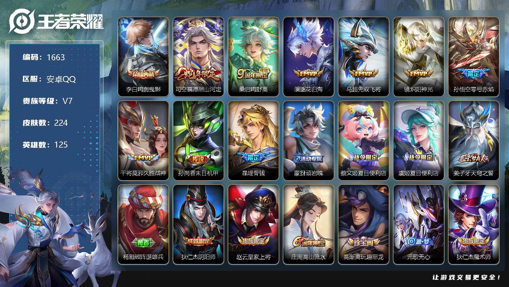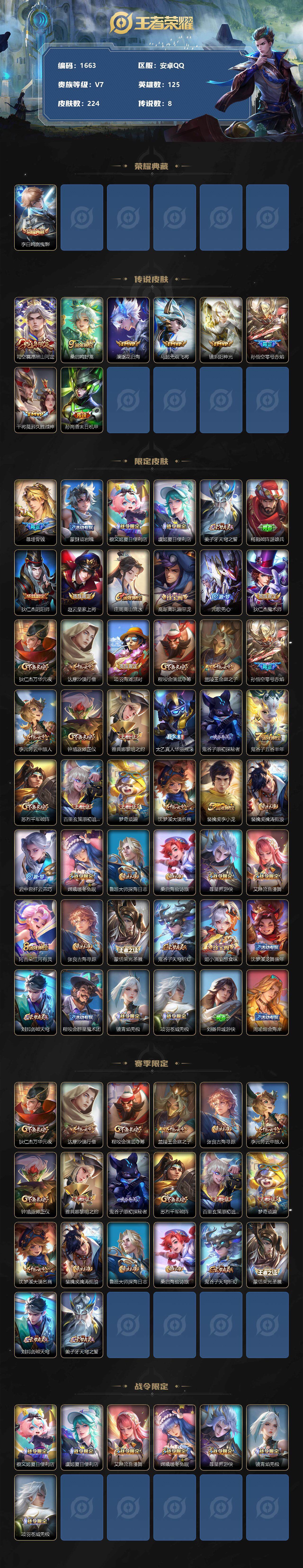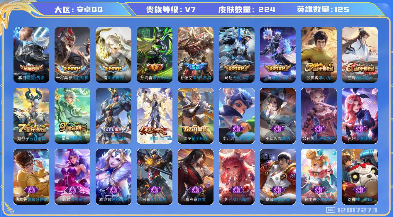[12017273]【商品标题】:安卓Q-V6-最强王者段位-125英雄-224皮肤-1典藏-0珍品无双-0无双-0珍品传说-8传说-60史诗
