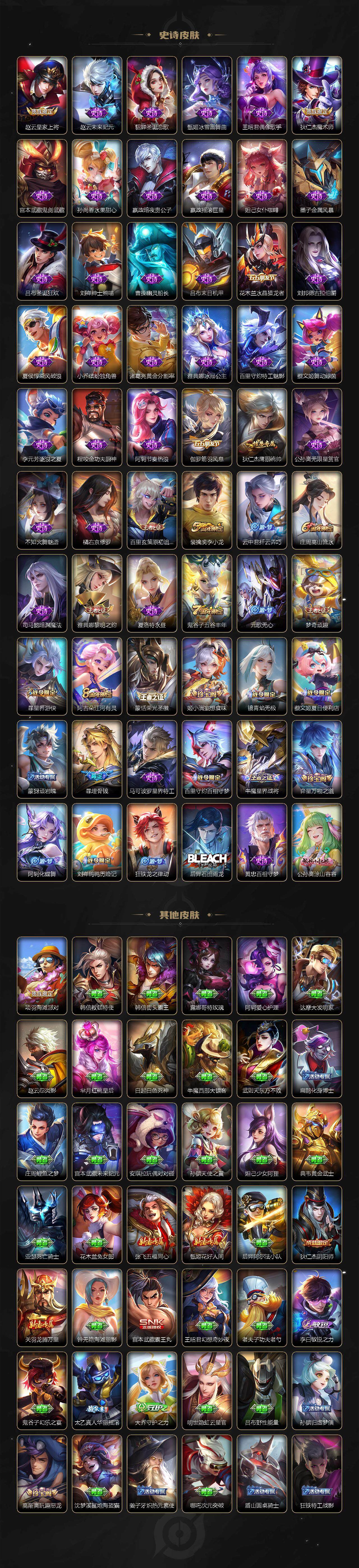 【史诗皮肤】:赵云皇家上将,赵云未来纪元,貂蝉圣诞恋歌,甄姬冰雪圆舞曲,王昭君偶像歌手,狄仁杰魔术师,宫本武藏鬼剑武藏,孙尚香水果甜心,嬴政暗夜贵公子,嬴政摇滚巨星,妲己女仆咖啡,墨子金属风暴,吕布圣诞狂欢,刘禅绅士熊喵,曹操幽灵船长,吕布末日机甲,花木兰水晶猎龙者,刘邦德古拉伯爵,夏侯惇乘风破浪,小乔缤纷独角兽,诸葛亮黄金分割率,雅典娜冰冠公主,百里守约特工魅影,蔡文姬舞动绿茵,李元芳逐浪之夏,程咬金功夫厨神,阿轲节奏热浪,伽罗箭羽风息,狄仁杰鹰眼统帅,公孙离无限星赏官,不知火舞魅语,橘右京修罗,百里玄策原初追逐者,裴擒虎李小龙,云中君纤云