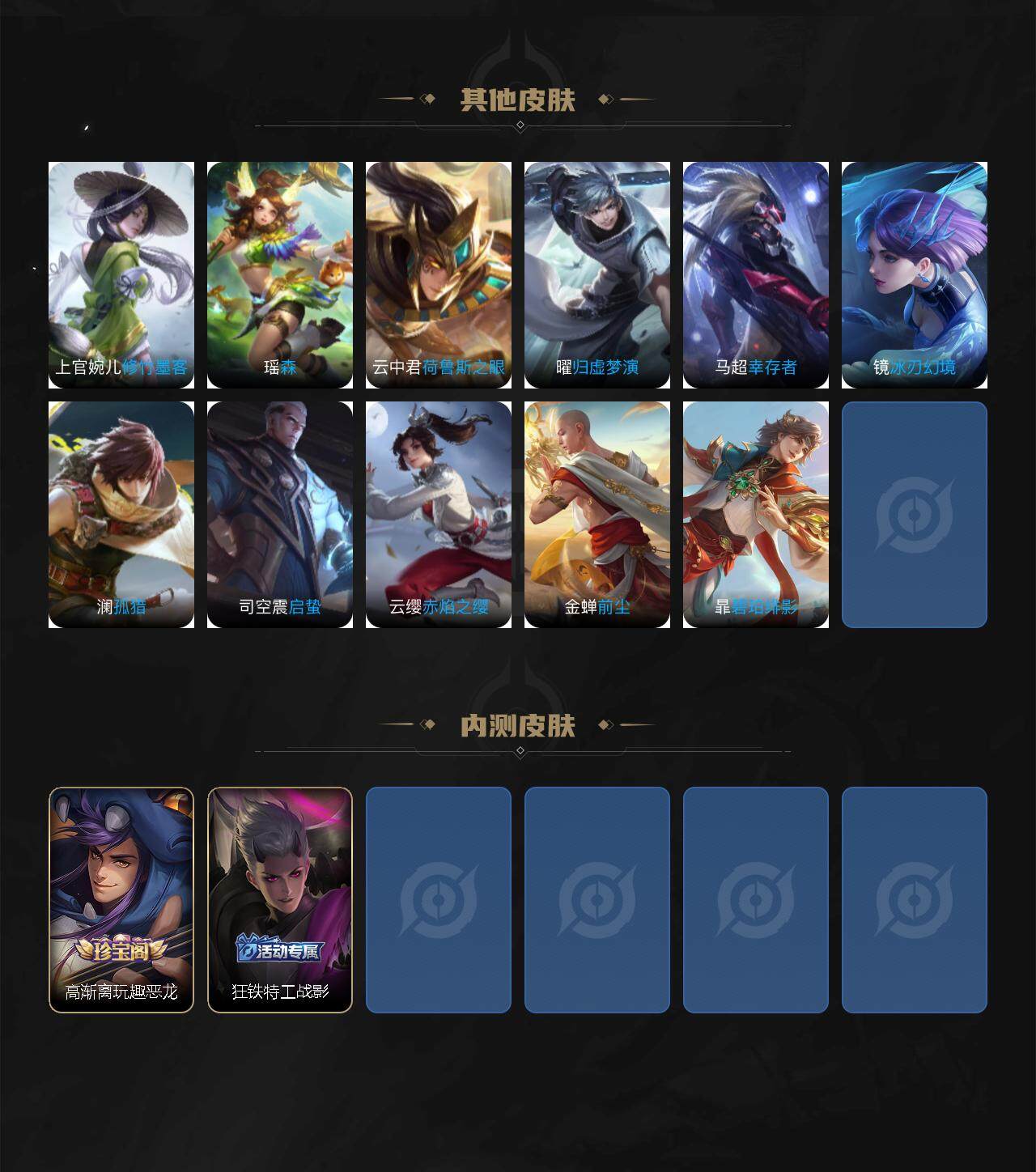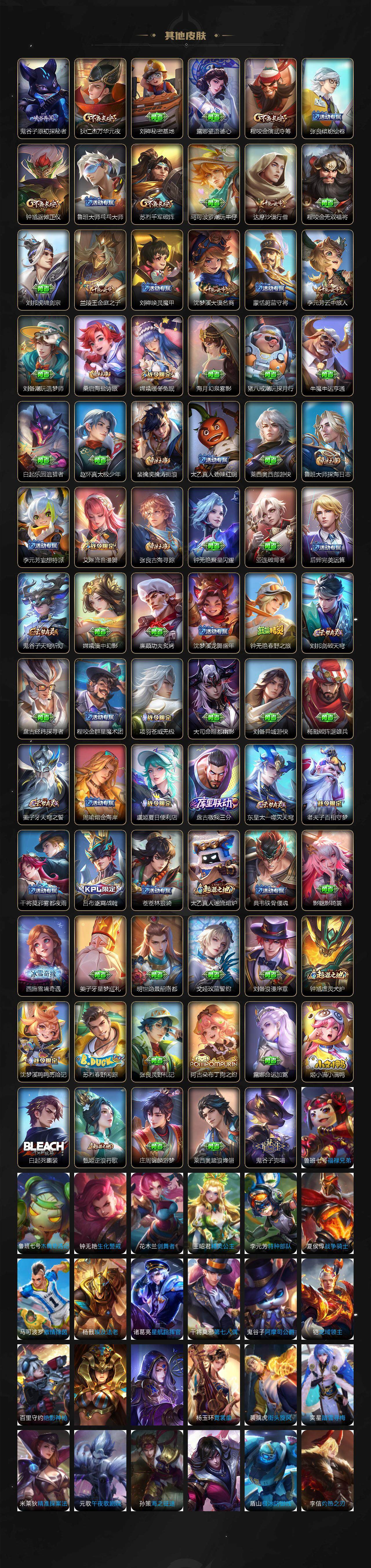 【限定皮肤】:暃埋骨钱,蒙犽顽岩魄,蔡文姬夏日便利店,虞姬夏日便利店,姜子牙天穹之誓,杨戬破阵退雄兵,狄仁杰阴阳师,赵云皇家上将,庄周高山流水,高渐离玩趣恶龙,元歌无心,狄仁杰魔术师,狄仁杰万华元夜,达摩沙漠行僧,项羽海滩派对,程咬金演武夺筹,兰陵王金庭之子,孙悟空零号赤焰,李元芳云中旅人,钟馗驱傩正仪,雅典娜黎明之约,太乙真人华丽摇滚,鬼谷子原初探秘者,鬼谷子五谷丰年,苏烈千军破阵,百里玄策原初追逐者,梦奇顽趣,沈梦溪大漠名商,裴擒虎李小龙,裴擒虎擒涛扼浪,云中君纤云弄巧,嫦娥暖冬兔眠,鲁班大师探海日志,桑启海盐诗旅,暃星界游侠,艾琳流音漫舞,阿古朵江河有灵,张良古海寻踪,蒙恬荣光圣徽,鬼谷子天穹祈灯,姬小满妄想食味,沈梦溪龙舞盛年,刘邦剑破天穹,程咬金群星魔术团,镜青焰无极,项羽苍威无极,刘备异域游侠,周瑜熔金海岸