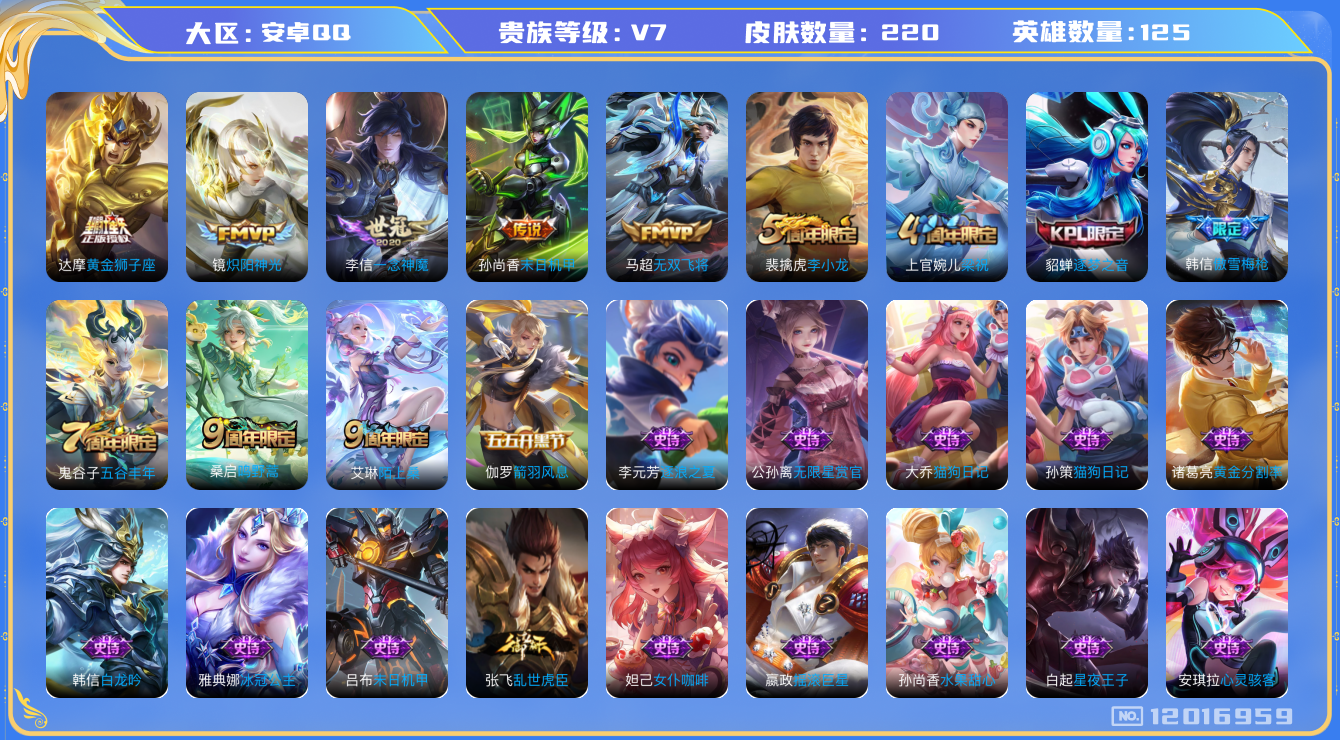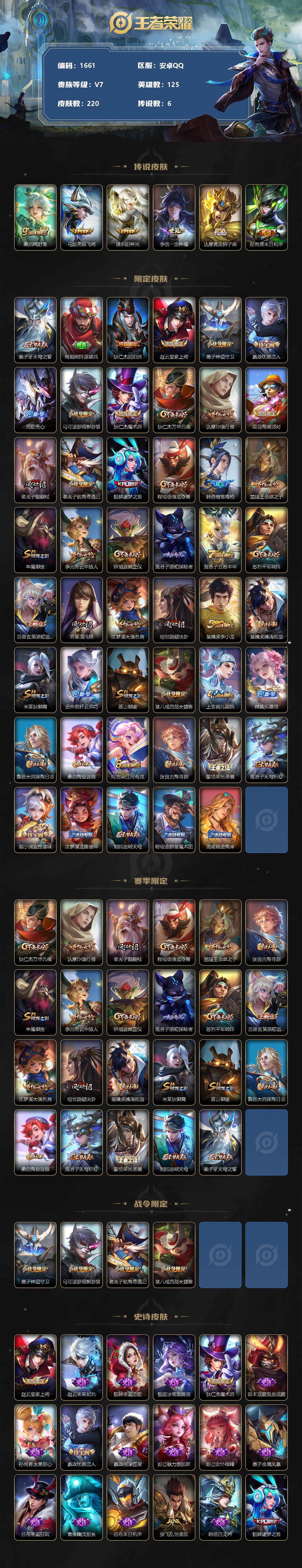 [12016959]【商品标题】:安卓Q-V7-最强王者段位-125英雄-220皮肤-0典藏-0珍品无双-0无双-0珍品传说-6传说-57史诗