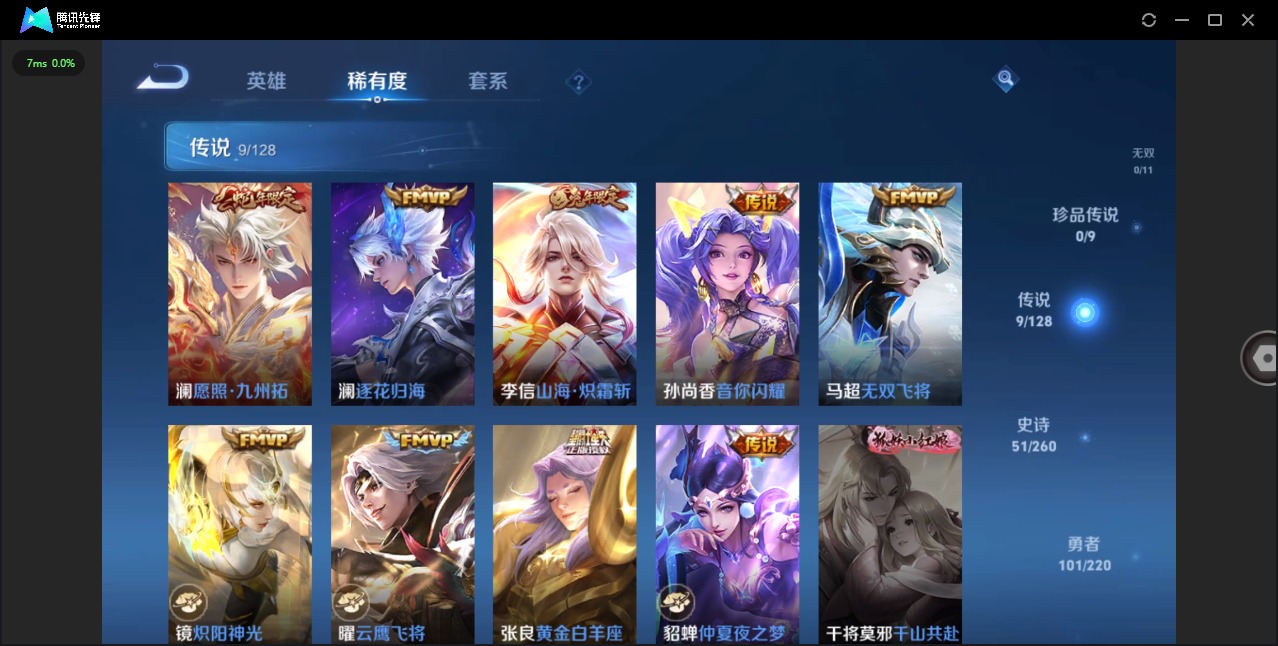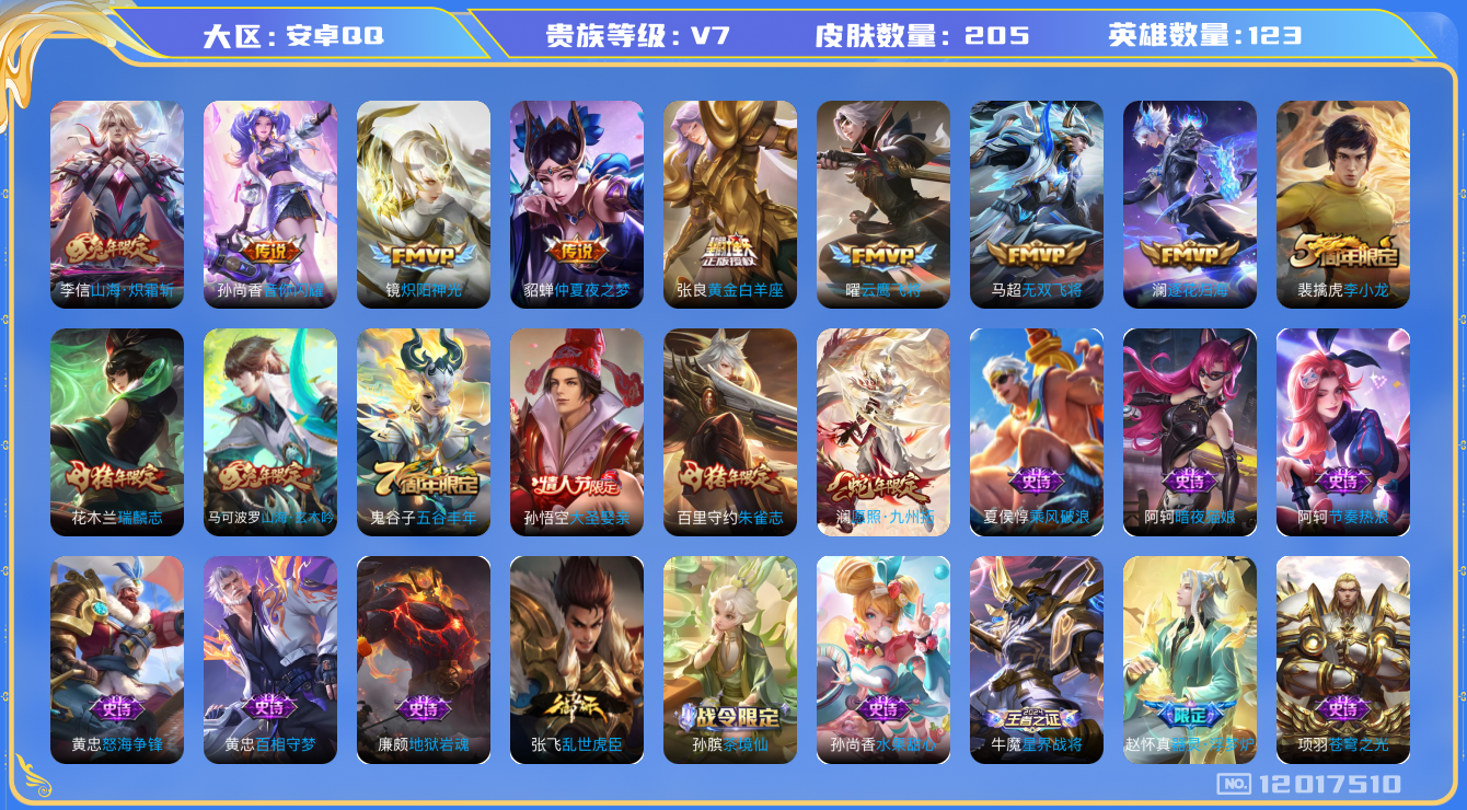 [12017510]V7 9传说 123英雄 205皮肤 可修改实名 优质装备:云鹰飞将(小将军),黄金白羊座,炽阳神光,仲夏夜之梦(大飞蛾),无双飞将,音你闪耀(rap皮),山海·炽霜斩(李信年限),澜逐花归海 珍宝阁皮:蔷薇恋人,玩趣恶龙 限定皮:愿照·九州拓(澜年限),瑞麟志(木兰年限),五谷丰年,李小龙,朱雀志(守约年限),大圣娶亲,山海·玄木吟(马可年限) 史诗皮:器灵·浮梦炉,星界战将,龙之律动,百相守梦-周瑜,茶境仙,怒海争锋,东方月初,百相守梦-黄忠,织梦人,遇见神鹿,苍穹之光,千年之狐,偶像歌手,暗夜猫娘,乱世虎臣,节奏热浪,女仆咖啡,摇滚巨星,水果甜心,天才门将,星夜王子,心灵骇客,功夫厨神,鬼剑武藏,暗渊魔法,心灵战警,地狱岩魂,乘风破浪,逐浪之夏,水晶猎龙者,金属风暴,原初追逐者,圣诞狂欢,鹰眼统帅,魅力维加斯,赏金猎手,无心,未来纪元-赵云