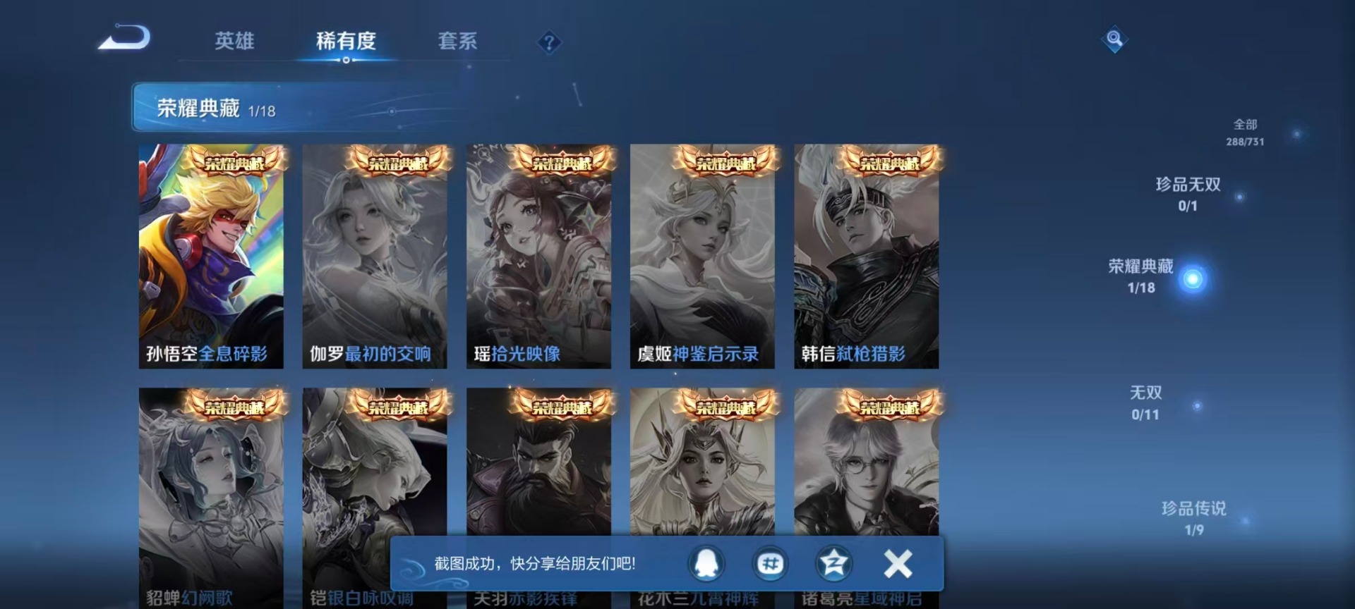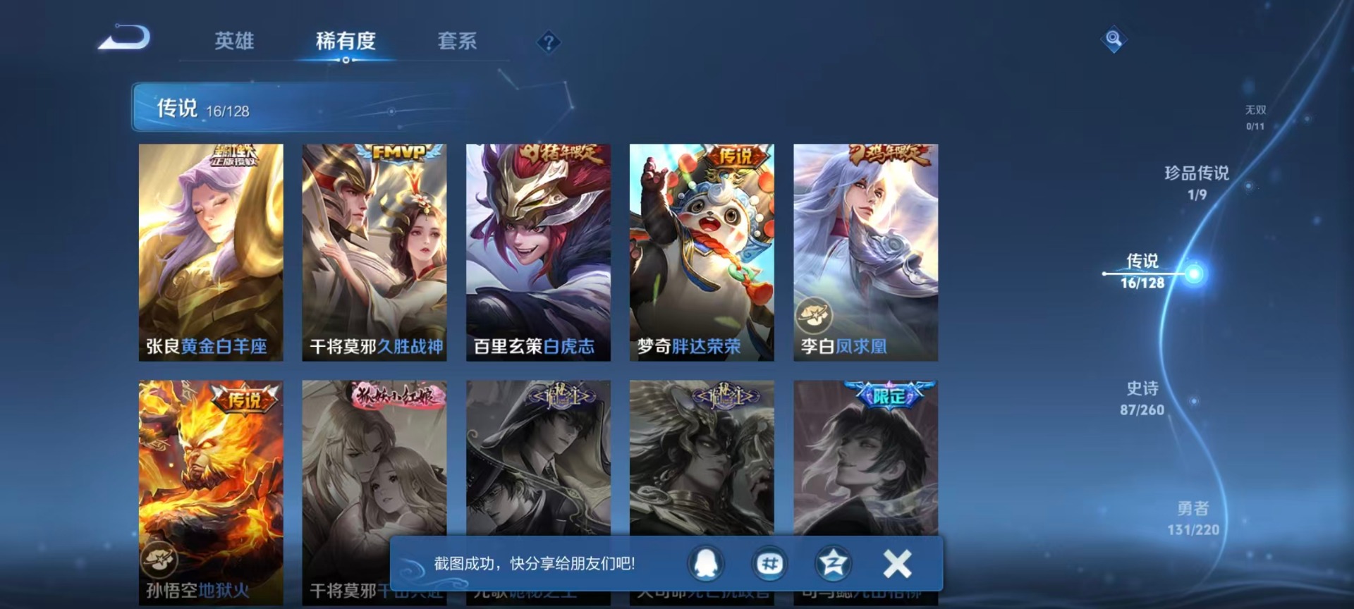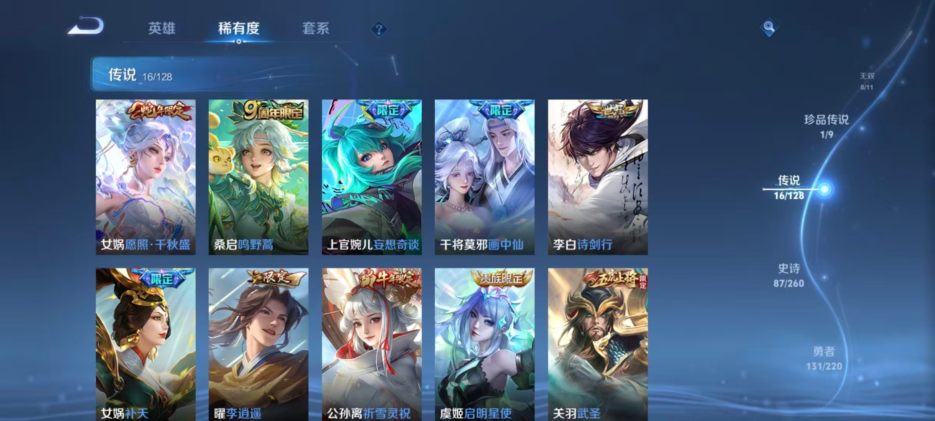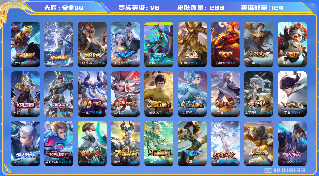 [12018133]V8 1典藏 1珍品传说 16传说 122英雄 269皮肤 可修改实名 荣耀水晶:全息碎影(猴子典藏) 珍品传说:器灵·落星盏 传说皮:李逍遥,黄金白羊座,地狱火,久胜战神,胖达荣荣,画中仙,妄想奇谈 珍宝阁皮:胡桃夹子,女武神,玩趣恶龙 限定皮:愿照·千秋盛(女娲年限),逐霄战戟,鸣野蒿,至尊宝,白虎志(电光耗子),凤求凰(白切鸡),傲雪梅枪,补天,飞衡(韩信年限),诗剑行,五谷丰年,冰锋战神,武圣,天狼运算者,梁祝,逐梦之星,奔雷神使(牛魔年限),祈雪灵祝(雪兔子),李小龙,逐梦之影,朱雀志(守约年限),默契交锋-花木兰,孙行者,神器·万象笔,山海·玄木吟(马可年限) 史诗皮:茶境仙,化蝶舞,紫霞仙子,电玩小子(小书包),白龙吟,黄金分割率,特工魅影,千年之狐,电玩·爆裂旋风,冰冠公主,江河有灵,高渐离燃音魔法,蒙恬荣光圣徽,偶像歌手,晚萤,魅语,猫狗日记-孙策,猫狗日记-大乔,乱世虎臣,节奏热浪,修罗,摇滚巨星,水果甜心,绅士熊喵,天才门将,星夜王子,心灵骇客,功夫厨神,德古拉伯爵,暗隐猎兽者,幽灵船长,鬼剑武藏,乐园奇幻夜,天秀·启明,地狱岩魂,纤云弄巧,繁星吟游(呼啦呼啦),拒霜思,缤纷独角兽,逐浪之夏,水晶猎龙者,热力回旋,箭羽风息,金属风暴,原初追逐者,圣诞狂欢,圣诞恋歌,鹰眼统帅,暗夜贵公子,魅力维加斯,无心,未来纪元-赵云