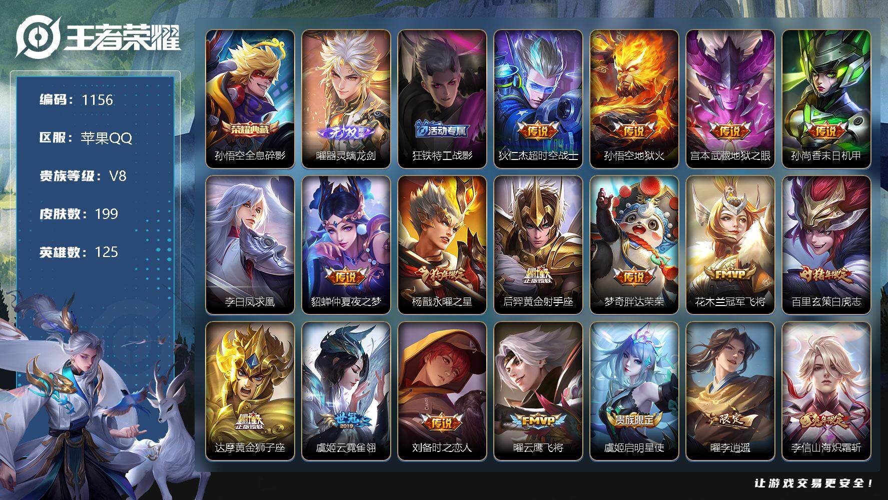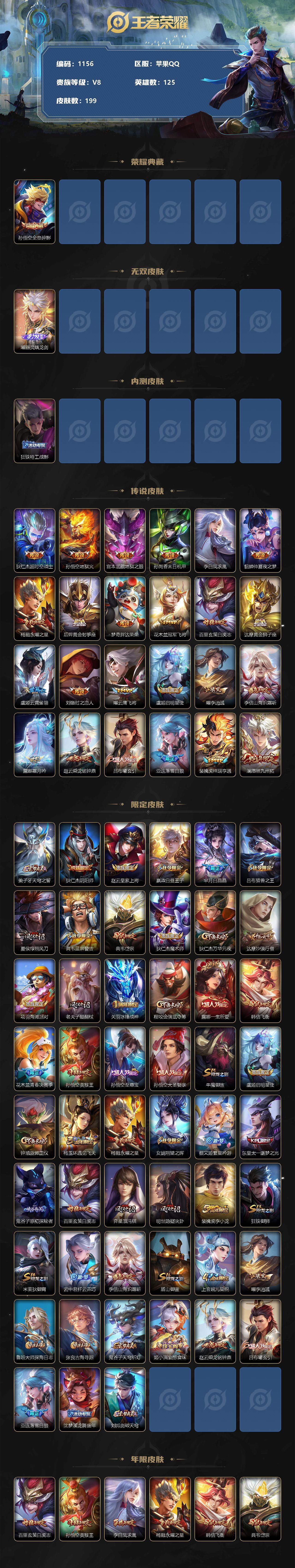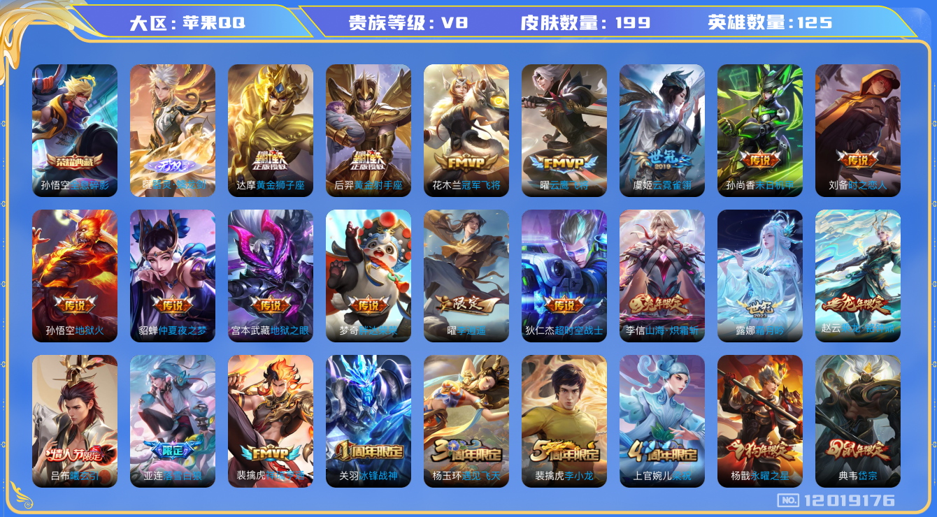 [12019176]【商品标题】:苹果Q-V8-永恒钻石II段位-125英雄-199皮肤-1典藏-0珍品无双-1无双-0珍品传说-24传说-56史诗