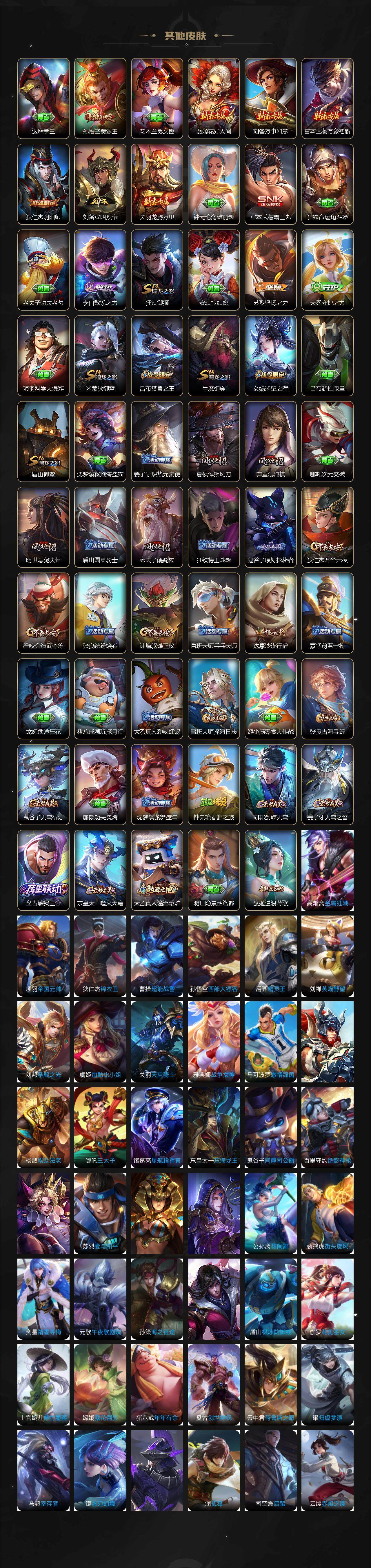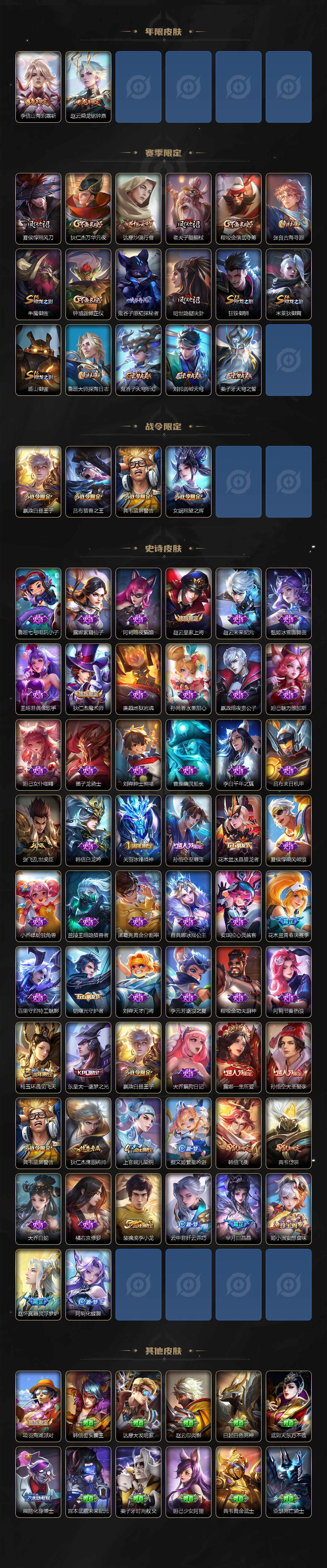 【赛季限定】:夏侯惇朔风刀,狄仁杰万华元夜,达摩沙漠行僧,老夫子醍醐杖,程咬金演武夺筹,张良古海寻踪,牛魔御旌,钟馗驱傩正仪,鬼谷子原初探秘者,弈星混沌棋,明世隐疑决卦,狂铁御狮,米莱狄御霄,盾山御銮,鲁班大师探海日志,鬼谷子天穹祈灯,刘邦剑破天穹,姜子牙天穹之誓
