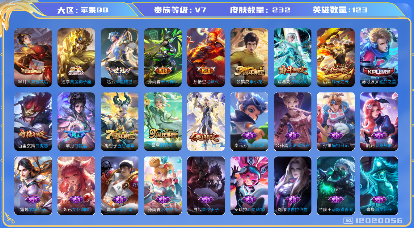 [12020056]【商品标题】:苹果Q-V2-尊贵铂金III段位-123英雄-232皮肤-1典藏-0珍品无双-0无双-0珍品传说-8传说-51史诗