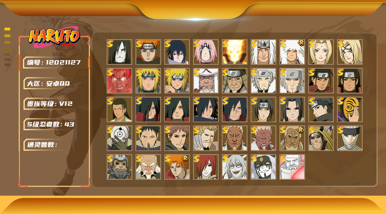 [12021127]V12 43S 可二次 S级忍者:宇智波止水「须佐能乎」,艾「忍界大战」,大筒木桃式,宇智波斑「秽土转生·解」,千手柱间·木叶创立,宇智波佐助「永恒万花筒」,春野樱 「忍界大战」,大筒木金式「博人传」,漩涡鸣人 「九喇嘛连结」,大野木 「忍界大战」,迈特凯「死门」,宇智波斑 「木叶创立」,宇智波带土 「忍界大战」,千手柱间「秽土转生」,罗砂「四代目风影」,自来也 「舞之豪杰」,宇智波鼬「秽土转生」,佩恩·天道「超」,药师兜「仙人模式」,宇智波斑「秽土转生」,艾「三代目雷影」,“宇智波斑” 「白面具」,半藏「秽土转生」,千手扉间「秽土转生」,纲手「百豪」,波风水门「秽土转生」,无「二代目土影」,金角/银角「秽土转生」,猿飞日斩「秽土转生」,长门「秽土转生」,鬼灯幻月「二代目水影」,宇智波斑,千手柱间,艾「四代目雷影」,千手扉间,神秘面具男,宇智波鼬 「须佐能乎」,佩恩「天道」,猿飞日斩,波风水门,大蛇丸,自来也,纲手
