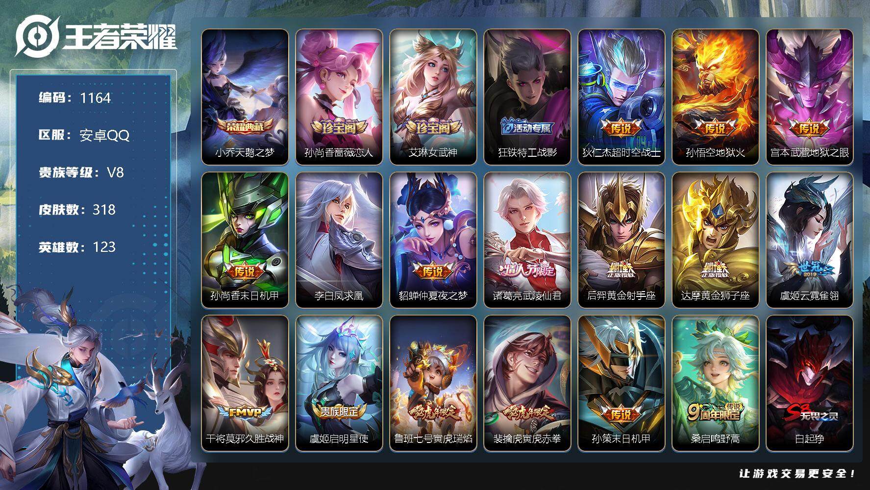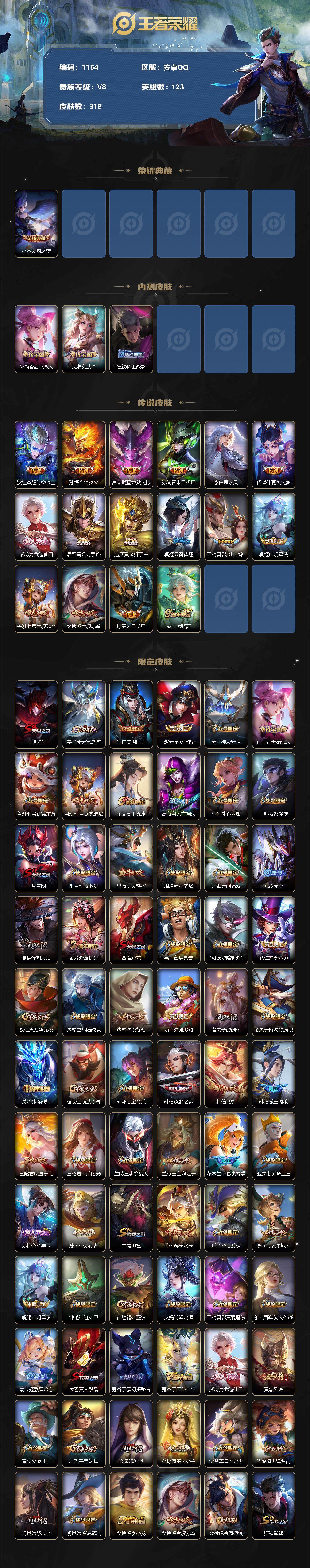 [12021471]【商品标题】:安卓Q-V0-尊贵铂金II段位-123英雄-318皮肤-1典藏-0珍品无双-0无双-0珍品传说-16传说-93史诗
