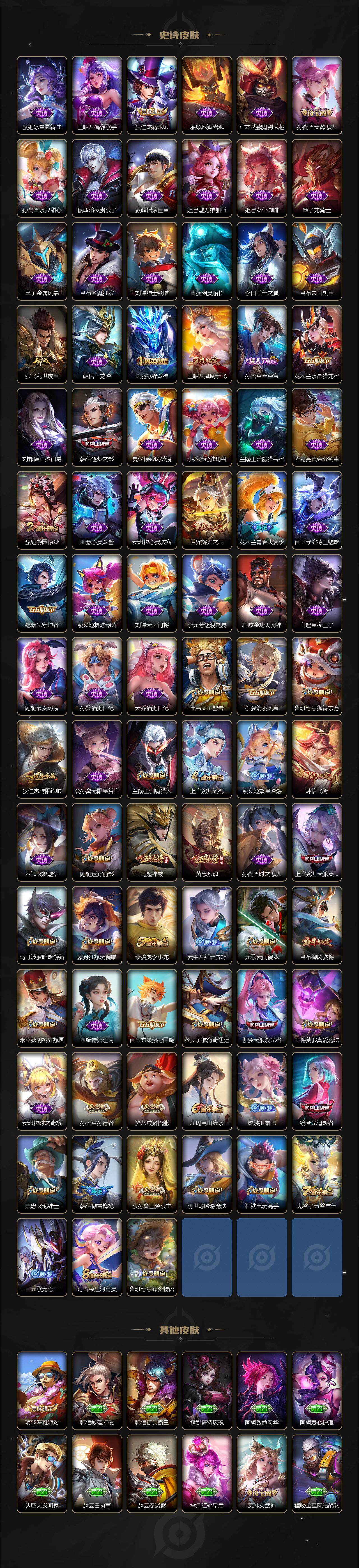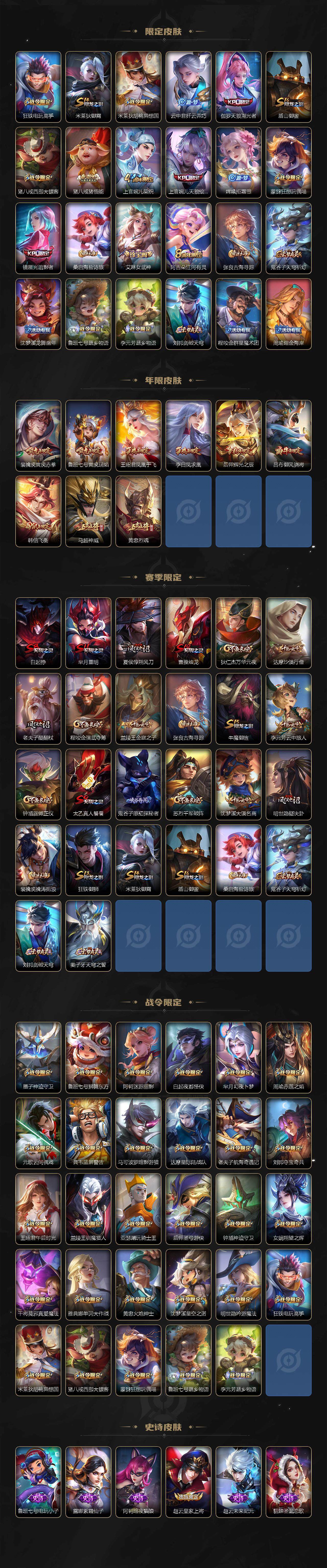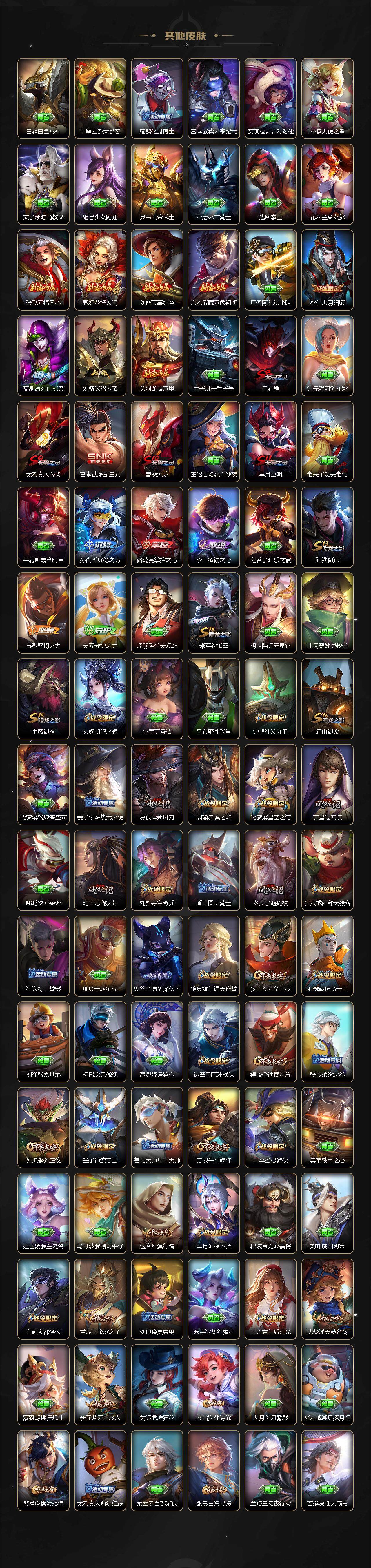 【限定皮肤】:白起狰,姜子牙天穹之誓,狄仁杰阴阳师,赵云皇家上将,墨子神迹守卫,孙尚香蔷薇恋人,鲁班七号狮舞东方,鲁班七号寅虎瑞焰,庄周高山流水,高渐离死亡摇滚,阿轲迷踪丽影,白起夜都怪侠,芈月重明,芈月幻夜卜梦,吕布御风骁将,周瑜赤莲之焰,元歌云间偶戏,元歌无心,夏侯惇朔风刀,甄姬游园惊梦,曹操烛龙,典韦蓝屏警告,马可波罗暗影游猎,狄仁杰魔术师,狄仁杰万华元夜,达摩星际陆战队,达摩沙漠行僧,项羽海滩派对,老夫子醍醐杖,老夫子航海奇遇记,关羽冰锋战神,程咬金演武夺筹,刘邦夺宝奇兵,韩信逐梦之影,韩信飞衡,韩信傲雪梅枪,王昭君凤凰于飞,王昭君午后时光,兰陵王驯魔猎人,兰陵王金庭之子,花木兰青春决赛季,亚瑟潮玩骑士王,孙悟空至尊宝,孙悟空孙行者,牛魔御旌,后羿辉光之辰,后羿圣弓游侠,李元芳云中旅人,虞姬启明星使,钟馗神迹守卫,钟馗驱傩正仪,女娲朔望之晖,干将莫邪真爱魔法,雅典娜单词大作战,蔡文姬繁星吟游,太乙真人饕餮,鬼谷子原初探秘者,鬼谷子五谷丰年,诸葛亮武陵仙君,黄忠烈魂,黄忠火炮绅士,苏烈千军破阵,弈星混沌棋,公孙离玉兔公主,沈梦溪星空之诺,沈梦溪大漠名商,明世隐疑决卦,明世隐吟游魔法,裴擒虎李小龙,裴擒虎寅虎赤拳,裴擒虎擒涛扼浪,狂铁御狮,狂铁电玩高手,米莱狄御霄,米莱狄胡桃异想国,云中君纤云弄巧,伽罗天狼溯光者,盾山御銮,猪八戒西部大镖客,猪八戒猪悟能,上官婉儿梁祝,上官婉儿天狼绘梦者,嫦娥拒霜思,蒙犽狂想玩偶喵,镜匿光追影者,桑启海盐诗旅,艾琳女武神,阿古朵江河有灵,张良古海寻踪,鬼谷子天穹祈灯,沈梦溪龙舞盛年,鲁班七号蔬乡物语,李元芳蔬乡物语,刘邦剑破天穹,程咬金群星魔术团,周瑜熔金海岸