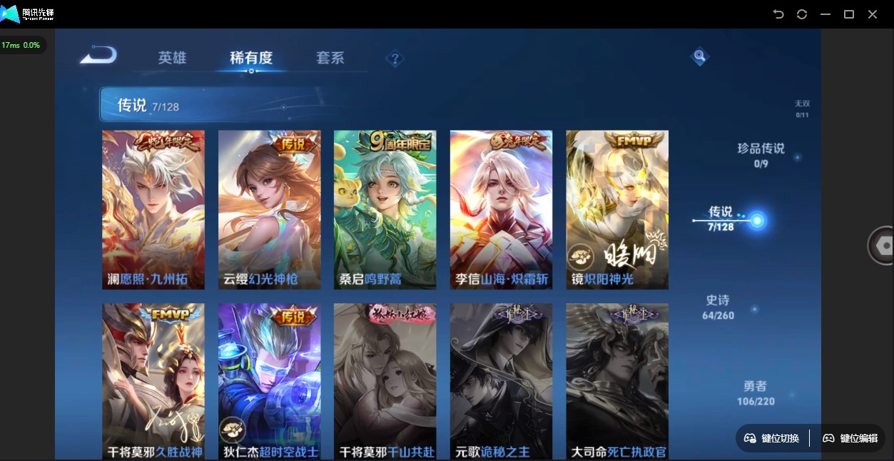 - [11605405]V5 4传说 104英雄 104皮肤 可修改实名 传说皮:典韦战鼓燎原,幻光神枪 珍宝阁皮:女武神 限定皮:愿照·九州拓(澜年限),逐霄战戟,鸣野蒿,李小龙 史诗皮:化蝶舞,破空之剑,蔬乡物语(鲁班七号),琥珀纪元伽罗,紫霞仙子,千年之狐,江河有灵,青蛇,猫狗日记-大乔,乱世虎臣,节奏热浪,摇滚巨星,水果甜心,天才门将,幽灵船长,鬼剑武藏,纤云弄巧,拒霜思,缤纷独角兽,逐浪之夏,圣诞恋歌,鹰眼统帅,雪上飞焰,未来纪元-赵云