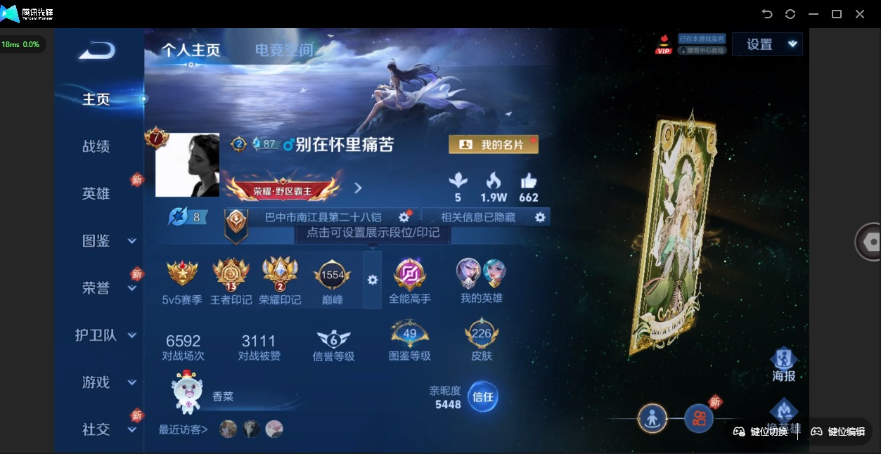 - [12090833]V8 1典藏 22传说 125英雄 117皮肤 可修改实名 优质装备:星空梦想(太空人),黄金射手座,绛天战甲(鸡嘴战神),黄金白羊座,一念神魔,云霓雀翎,地狱火,地狱之眼,乞巧织情,淬星耀世,超时空战士-狄仁杰,无双飞将,音你闪耀(rap皮),记忆之芯(机甲兔),妄想实况,惊梅引,小动物乐团,霜月吟,玄雷天君,涂山容容 传说皮:典韦战鼓燎原 限定皮:映山客,诗剑行 史诗皮:鸭鸭历险记-刘禅,龙之律动,战舞者,百相守梦-百里守约,星界特工,白龙吟,特工魅影,永昼,闲日渔趣,冰冠公主,暗夜猫娘,龙骑士(小龙虾),乱世虎臣,女仆咖啡,摇滚巨星,水果甜心,天才门将,时之奇旅-安琪拉,乐园奇幻夜,舞动绿茵,纤云弄巧,逐浪之夏,月团寄思,水晶猎龙者,箭羽风息,圣诞狂欢,鹰眼统帅,魅力维加斯,天秀·音浪