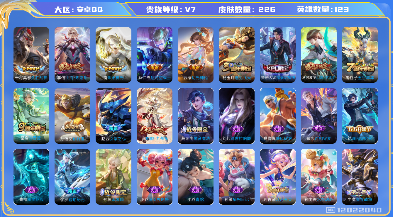 [12022040]V7 7传说 123英雄 226皮肤 可修改实名 优质装备:久胜战神,炽阳神光,超时空战士-狄仁杰,山海·炽霜斩(李信年限) 传说皮:幻光神枪 珍宝阁皮:万物之道,优雅恋人 限定皮:愿照·九州拓(澜年限),鸣野蒿,遇见飞天,五谷丰年,孙行者,引擎之心,匿光启智者,山海·玄木吟(马可年限) 史诗皮:星界战将,茶境仙,蒙犽顽岩魄,琥珀纪元伽罗,百相守梦-百里守约,百相守梦-黄忠,织梦人,紫霞仙子,特工魅影,江河有灵,百解令(蒙犽),高渐离燃音魔法,蒙恬荣光圣徽,冰冠公主,青蛇,电玩·爆裂旋风,末日机甲-吕布,猫狗日记-孙策,修罗,女仆咖啡,水果甜心,绅士熊喵,星夜王子,心灵骇客,功夫厨神,德古拉伯爵,暗隐猎兽者,幽灵船长,鬼剑武藏,心灵战警,纤云弄巧,缤纷独角兽,乘风破浪,逐浪之夏,水晶猎龙者,曙光守护者,热力回旋,金属风暴,原初追逐者,圣诞狂欢,圣诞恋歌,鹰眼统帅,魅力维加斯,无心,未来纪元-赵云