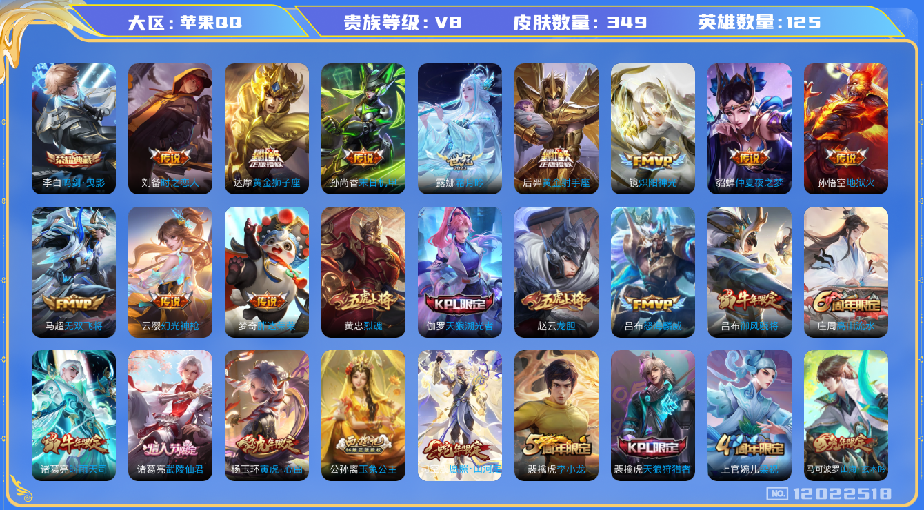 [12022518]V8 1典藏 18传说 125英雄 349皮肤 可修改实名 优质装备:鸣剑·曳影,黄金狮子座,黄金射手座,炽阳神光,末日机甲-孙尚香(绿蚂蚱),地狱火,仲夏夜之梦(大飞蛾),胖达荣荣,时之恋人-刘备(电焊工),无双飞将,霜月吟,涂山容容 传说皮:幻光神枪 珍宝阁皮:妄想食味,胡桃夹子,女武神 限定皮:愿照·九州拓(澜年限),愿照·山河定(司空震年限),至尊宝,白虎志(电光耗子),武陵仙君(小桃花),白晶晶,时雨天司(水龙头),神威(电光马子),山海·碧波行(瑶年限),高山流水,怒海麟威,五谷丰年,梁祝,御风骁将(吕布年限),天狼狩猎者,龙胆,烈魂,天狼溯光者,李小龙,逐梦之影,朱雀志(守约年限),大圣娶亲,寅虎·心曲(虎婆),玉兔公主,山海·玄木吟(马可年限) 史诗皮:器灵·浮梦炉,星界战将,龙之律动,石田雨龙,百相守梦-周瑜,怒海争锋,蔬乡物语(鲁班七号),百相守梦-百里守约,百相守梦-黄忠,紫霞仙子,苍穹之光,白龙吟,特工魅影,千年之狐,永昼,江河有灵,魅语,百解令(蒙犽),高渐离燃音魔法,蒙恬荣光圣徽,匿光破解者,冰冠公主,偶像歌手,晚萤,电玩·爆裂旋风,猫狗日记-孙策,乱世虎臣,节奏热浪,修罗,女仆咖啡,摇滚巨星,水果甜心,天才门将,星夜王子,心灵骇客,功夫厨神,德古拉伯爵,暗隐猎兽者,幽灵船长,鬼剑武藏,地狱岩魂,纤云弄巧,繁星吟游(呼啦呼啦),拒霜思,缤纷独角兽,乘风破浪,逐浪之夏,水晶猎龙者,曙光守护者,箭羽风息,金属风暴,原初追逐者,圣诞狂欢,圣诞恋歌,鹰眼统帅,魅力维加斯,黎明之约,赏金猎手,未来纪元-赵云