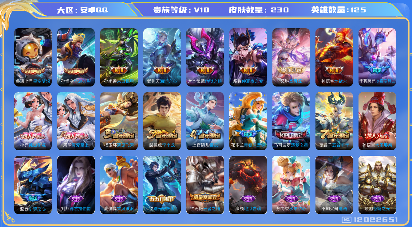 [12022651]V10 2典藏 7传说 125英雄 230皮肤 典藏英雄武则天 可修改实名 优质装备:星空梦想(太空人),全息碎影(猴子典藏),末日机甲-孙尚香(绿蚂蚱),地狱火,仲夏夜之梦(大飞蛾),海洋之心,地狱之眼,艾琳觅芳踪 珍宝阁皮:蔷薇恋人 限定皮:遇见飞天,五谷丰年,梁祝,逐梦之星,李小龙,真爱至上,纯白花嫁,大圣娶亲,引擎之心,青春决赛季,冰霜恋舞曲 史诗皮:苍穹之光,黄金分割率,特工魅影,千年之狐,魅语,冰冠公主,偶像歌手,末日机甲-吕布,女仆咖啡,水果甜心,天才门将,星夜王子,德古拉伯爵,鬼剑武藏,心灵战警,舞动绿茵,地狱岩魂,繁星吟游(呼啦呼啦),乘风破浪,逐浪之夏,水晶猎龙者,曙光守护者,金属风暴,原初追逐者,圣诞狂欢,鹰眼统帅,王者之锤,魅力维加斯,无心,未来纪元-赵云