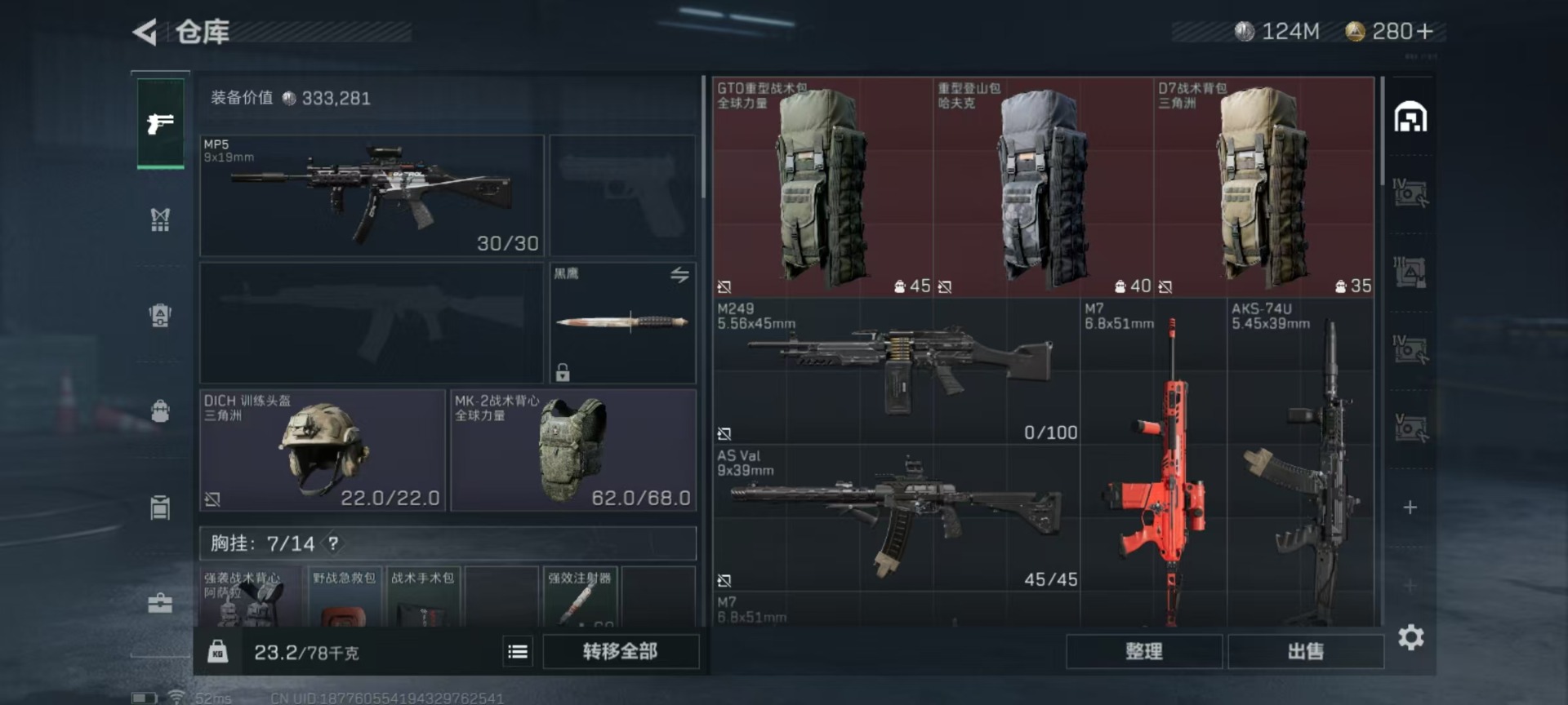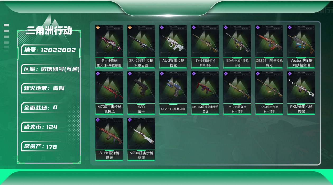 [12022802]总资产:176.67 2传说枪械 进阶安全箱(2×2)9.15号到期 可二次 可修改实名 烽火地带段位:青铜 全面战场段位:无段位 哈夫币:124 传说武器皮肤:SR-25射手步枪-水墨云图,勇士冲锋枪-能天使-午夜邮差 史诗武器皮肤:SR-3M紧凑突击步枪-英雄,AUG突击步枪-蝮蛇,M700狙击步枪-蝮蛇,PKM通用机枪-蝮蛇,AKM突击步枪-林中猎手,M1014霰弹枪-林中猎手,SV-98狙击步枪-林中猎手,SCAR-H战斗步枪-囚徒,QBZ95-1突击步枪-曙光,Vector冲锋枪-阿萨拉文明,S12K霰弹枪-曙光,M700狙击步枪-竞技风,QSZ92G-风林火山,93R-博士