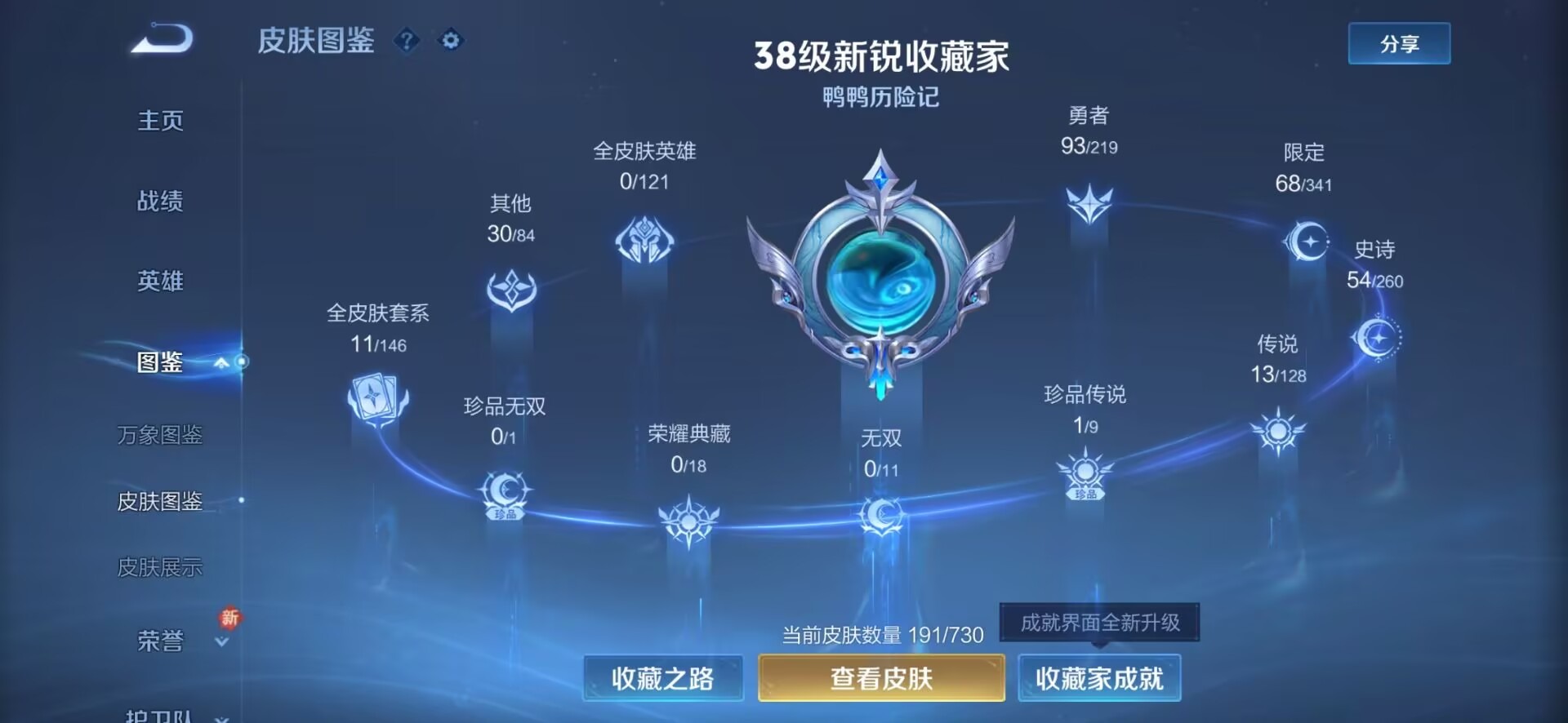 - PX_2096299-实名: 可修改 贵族等级: V4 英雄数: 97 皮肤数: 82 珍品传说: 大耳狗之梦 星传说: 未来机甲 传说皮: 末日机甲-孙尚香,音你心动-小乔 限定皮: 至美·乘鲤谣,鸣野蒿