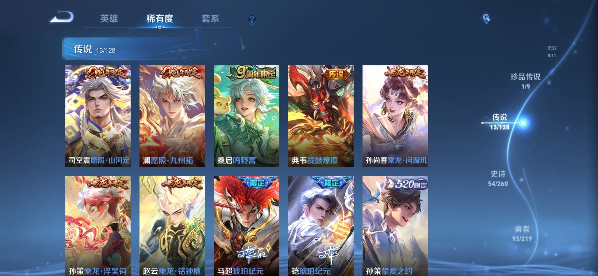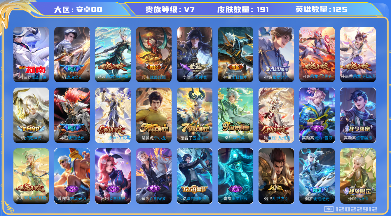 [12022912]V7 1珍品传说 13传说 125英雄 191皮肤 可修改实名 优质装备:怪盗基德,炽阳神光,一念神魔,末日机甲-孙策,挚爱之约,琥珀纪元铠,琥珀纪元马超,涂山容容 传说皮:乘龙·问璇玑(孙尚香年限),乘龙·铭钟鼎(赵云年限),乘龙·淬吴钩(孙策年限),典韦战鼓燎原 珍宝阁皮:妄想食味,玩趣恶龙 限定皮:愿照·九州拓(澜年限),愿照·山河定(司空震年限),鸣野蒿,五谷丰年,李小龙 史诗皮:鸭鸭历险记-刘禅,器灵·浮梦炉,星界战将,龙之律动,石田雨龙,百相守梦-周瑜,茶境仙,琥珀纪元伽罗,乘龙·聚宝船(安琪拉年限),乘龙·忆丹青(大乔年限),百相守梦-黄忠,紫霞仙子,特工魅影,千年之狐,永昼,浮梦罗烟,百解令(蒙犽),高渐离燃音魔法,蒙恬荣光圣徽,偶像歌手,猫狗日记-孙策,乱世虎臣,节奏热浪,女仆咖啡,水果甜心,天才门将,星夜王子,暗隐猎兽者,幽灵船长,鬼剑武藏,暗渊魔法,天秀·启明,纤云弄巧,拒霜思,乘风破浪,逐浪之夏,水晶猎龙者,曙光守护者,金属风暴,原初追逐者,圣诞狂欢,鹰眼统帅,赏金猎手,天秀·音浪,未来纪元-赵云