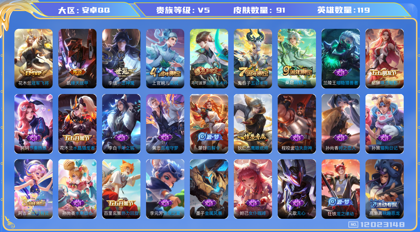 [12023148]V5 4传说 119英雄 91皮肤 可修改实名 优质装备:冠军飞将,绛天战甲(鸡嘴战神),一念神魔 珍宝阁皮:万物之道,玩趣恶龙 限定皮:鸣野蒿,五谷丰年,梁祝,山海·玄木吟(马可年限) 史诗皮:龙之律动,百相守梦-黄忠,千年之狐,江河有灵,百解令(蒙犽),猫狗日记-孙策,时之恋人-孙尚香,节奏热浪,女仆咖啡,水果甜心,功夫厨神,暗隐猎兽者,逐浪之夏,水晶猎龙者,热力回旋,唤灵魅影,金属风暴,鹰眼统帅,无心
