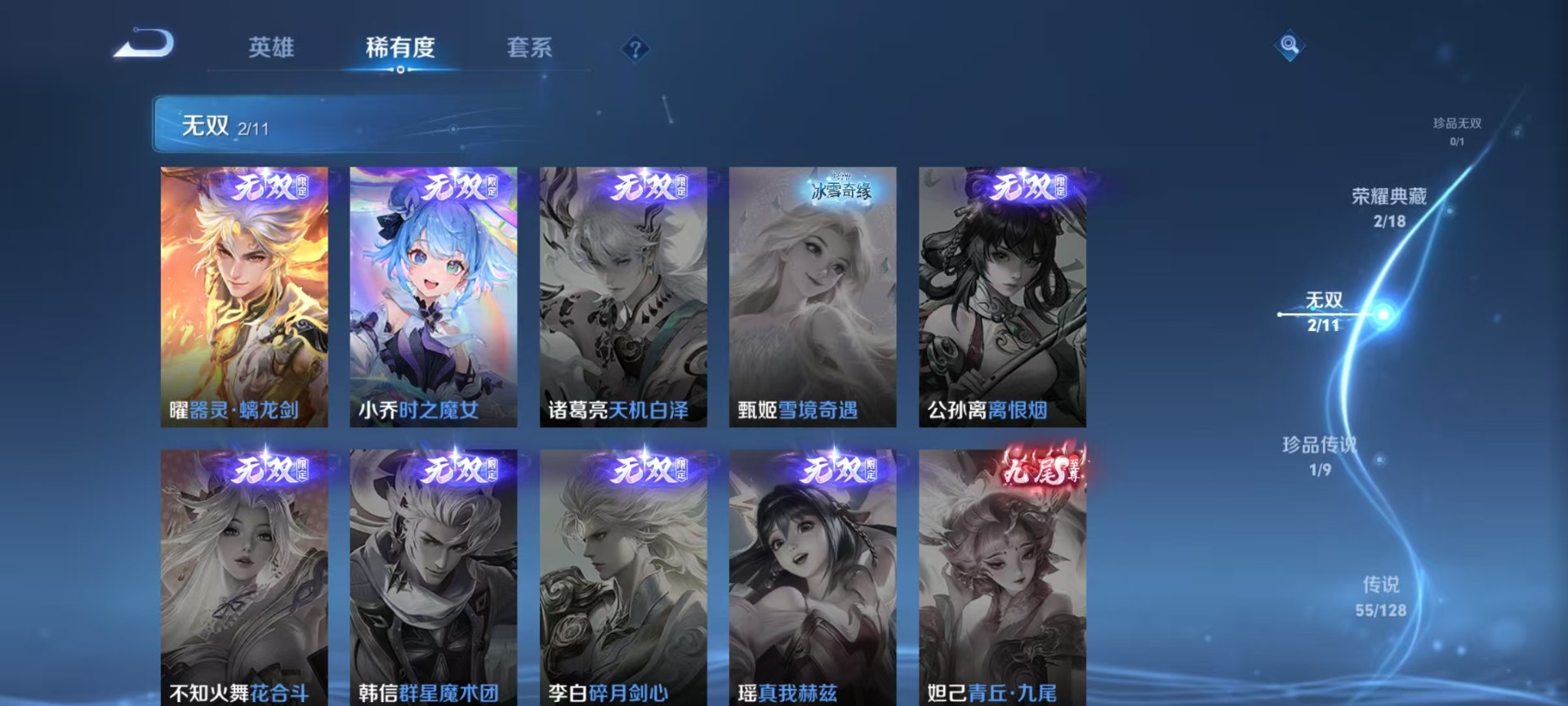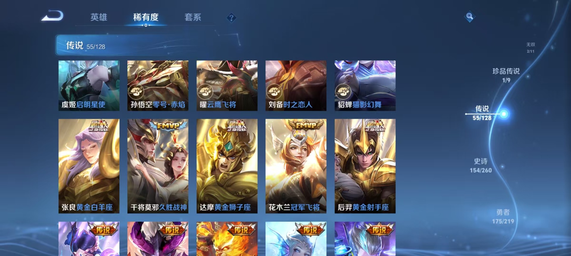 铠绛天战甲,刘备时之恋人,干将莫邪久胜战神,典韦战鼓燎原,干将莫邪画中仙,孙策末日机甲,达摩黄金狮子座,王昭君乞巧织情,鲁班七号时之奇旅,露娜霜月吟,后羿千劫归真,庄周牧神诗旅,镜炽阳神光,公孙离记忆之芯,杨玉环星之鸣奏,裴擒虎祥瑞亨通,貂蝉猫影幻舞,夏洛特浮生妄,艾琳觅芳踪,西施游龙清影,西施续相思,嬴政玄雷天君,张良黄金白羊座,孙悟空零号·赤焰,曜云鹰飞将,马超无双飞将,百里守约碎云,澜逐花归海,云缨幻光神枪