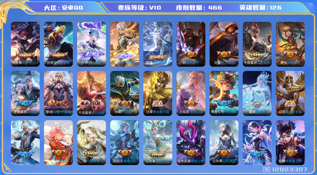 [12023307]V10 2典藏 2无双 1珍品传说 55传说 126英雄 466皮肤 典藏英雄武则天 可修改实名 优质装备:杀手不太冷,全息碎影(猴子典藏),小乔时之魔女(小乔无双),器灵·螭龙剑,器灵·落星盏,黄金狮子座,黄金射手座,冠军飞将,云鹰飞将(小将军),绛天战甲(鸡嘴战神),黄金白羊座,猫影幻舞,久胜战神,炽阳神光,地狱火,仲夏夜之梦(大飞蛾),零号·赤焰,海洋之心,地狱之眼,乞巧织情,时之恋人-刘备(电焊工),游龙清影(小青龙),超时空战士-狄仁杰,末日机甲-孙策,无双飞将,碎云,山海·炽霜斩(李信年限),画中仙,浮生妄,记忆之芯(机甲兔),灼幽烈阳,鲁班七号-时之奇旅,霜月吟,澜逐花归海,艾琳觅芳踪,牧神诗旅,玄雷天君,千劫归真,千山共赴,涂山容容 传说皮:典韦战鼓燎原,云诺千山,续相思,星之鸣奏,祥瑞亨通,幻光神枪 珍宝阁皮:万物之道,优雅恋人,女武神 限定皮:愿照·九州拓(澜年限),愿照·福禄聚(蔡文姬年限),愿照·岁时盈(虞姬年限),愿照·山河定(司空震年限),愿照·众生和(妲己年限),愿照·千秋盛(女娲年限),逐霄战戟,映山客,陌上桑,鸣野蒿,至尊宝,傲雪梅枪,绯月行,时之彼端,魔法小厨娘,白晶晶,时雨天司(水龙头),神威(电光马子),山海·碧波行(瑶年限),诗剑行,齐天大圣,怒海麟威,五谷丰年,冰锋战神,游园惊梦,梁祝,御风骁将(吕布年限),烈魂,逐梦之音,祈雪灵祝(雪兔子),李小龙,朱雀志(守约年限),圣诞老人,一生所爱,大圣娶亲,引擎之心,冰霜恋舞曲,美猴王,神器·万象笔,山海·玄木吟(马可年限),冰霜神祇 史诗皮:鸭鸭历险记-刘禅,飞车小橘子,苍鳞隐世,器灵·浮梦炉,糖绘人间,狼魂孤将,绮世丹青,瑰影绮梦,化蝶舞,灵蛊蚀心,星界战将,谪仙醉月,雪豹·霜爪,藏狐·褐绒,石田雨龙,戍鼓铭心,茶境仙,幻珠鲛人,怒海争锋,炽弈燎原,破空之剑,东方月初,蒙犽顽岩魄,芈月浮光幕影,琥珀纪元伽罗,决胜骁骑,上官婉儿群星魔术团,蔬乡物语(鲁班七号),百相守梦-百里守约,星界特工,百相守梦-黄忠,遇见神鹿,紫霞仙子,苍穹之光,电玩小子(小书包),白龙吟,黄金分割率,特工魅影,千年之狐,永昼,江河有灵,真我赫兹(百里守约),完美假期,魅语,高渐离燃音魔法,蒙恬荣光圣徽,无限星赏官,匿光破解者,冰冠公主,青蛇,偶像歌手,白蛇,晚萤,暗夜猫娘,百相守梦(关羽),银翎春