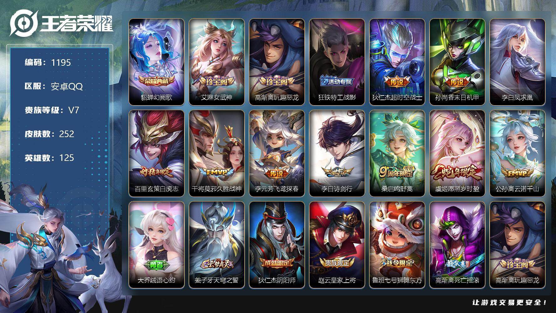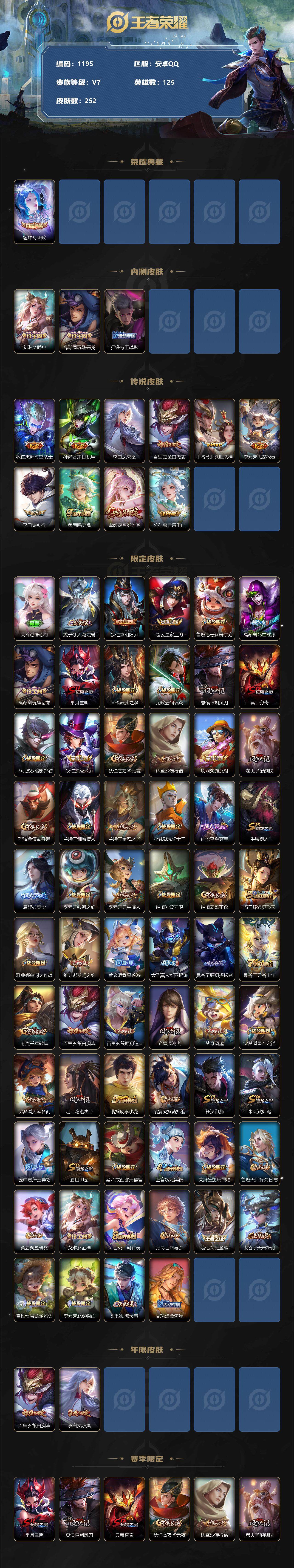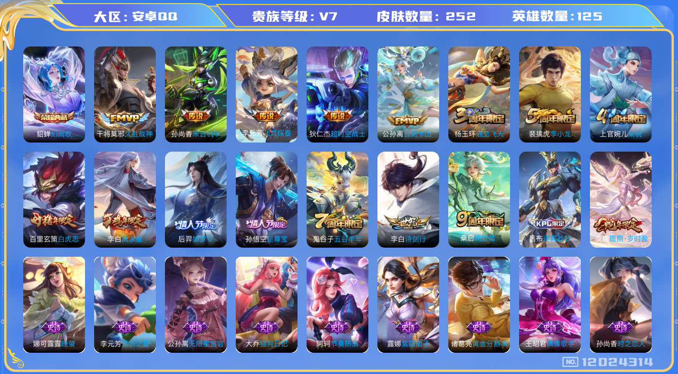 [12024314]【商品标题】:安卓Q-V7-至尊星耀IV段位-125英雄-252皮肤-1典藏-0珍品无双-0无双-0珍品传说-10传说-64史诗