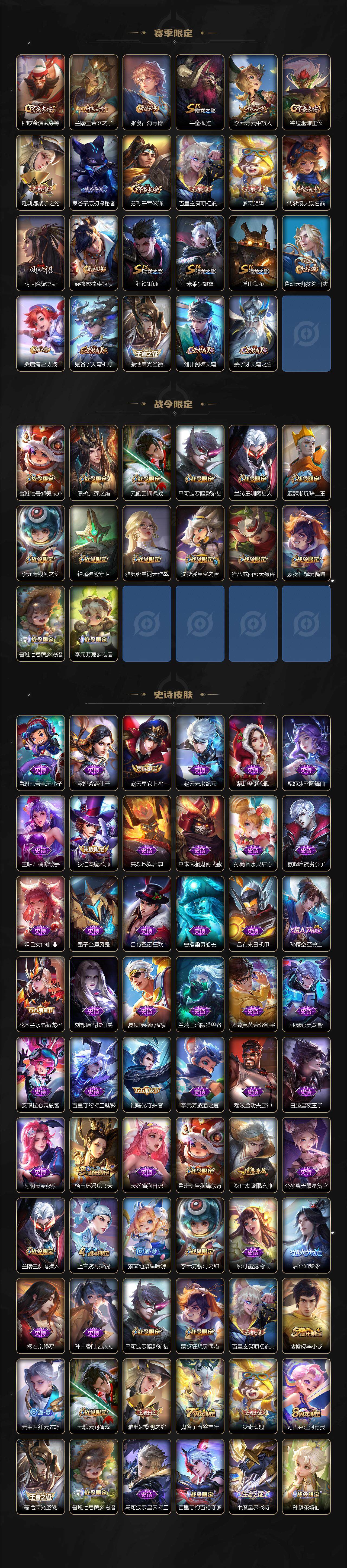 【赛季限定】:芈月重明,夏侯惇朔风刀,典韦穷奇,狄仁杰万华元夜,达摩沙漠行僧,老夫子醍醐杖,程咬金演武夺筹,兰陵王金庭之子,张良古海寻踪,牛魔御旌,李元芳云中旅人,钟馗驱傩正仪,雅典娜黎明之约,鬼谷子原初探秘者,苏烈千军破阵,百里玄策原初追逐者,弈星混沌棋,梦奇顽趣,沈梦溪大漠名商,明世隐疑决卦,裴擒虎擒涛扼浪,狂铁御狮,米莱狄御霄,盾山御銮,鲁班大师探海日志,桑启海盐诗旅,鬼谷子天穹祈灯,蒙恬荣光圣徽,刘邦剑破天穹,姜子牙天穹之誓