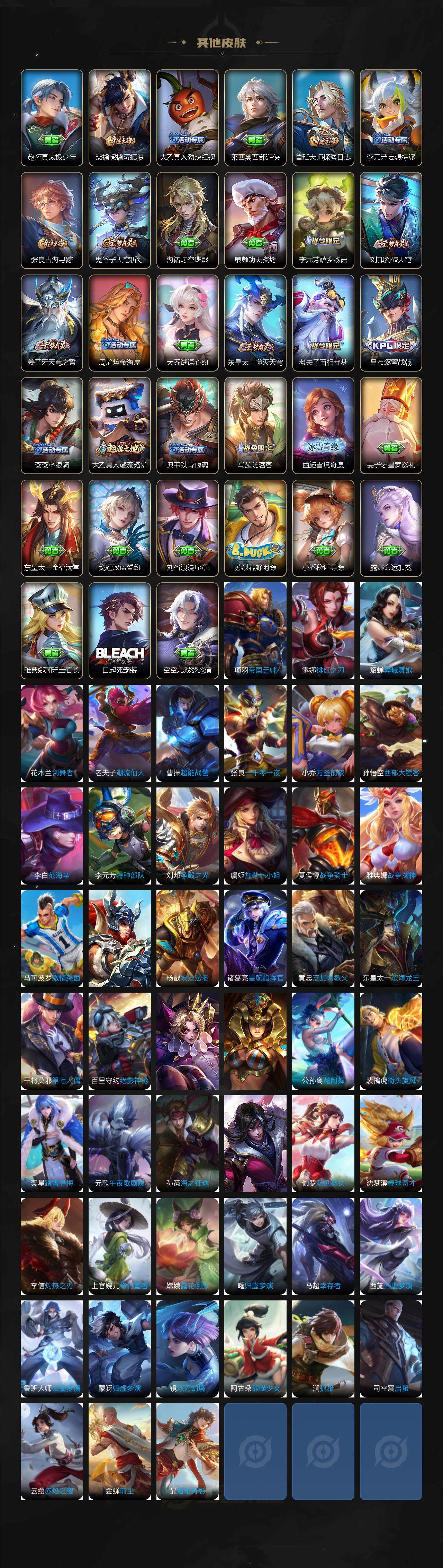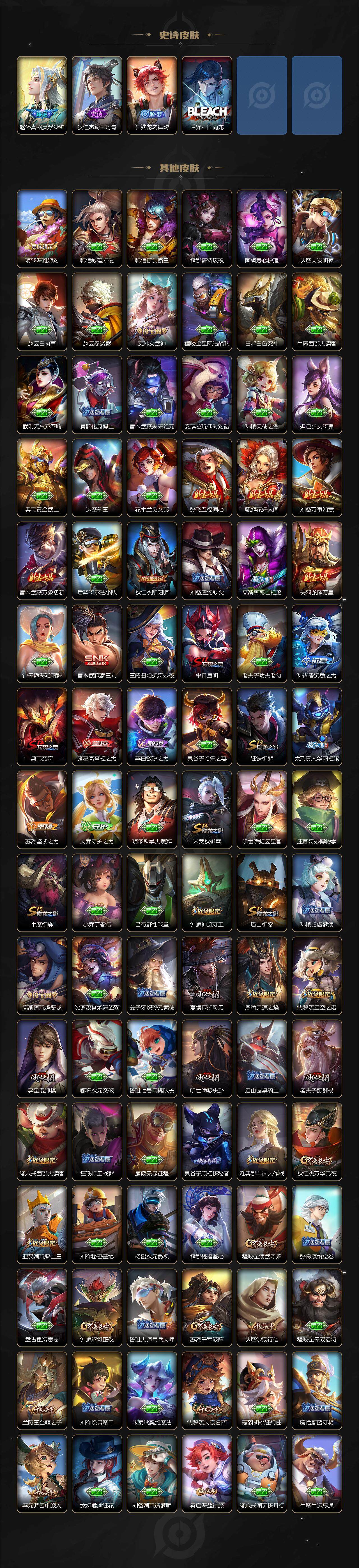 【限定皮肤】:大乔绒语心约,姜子牙天穹之誓,狄仁杰阴阳师,赵云皇家上将,鲁班七号狮舞东方,高渐离死亡摇滚,高渐离玩趣恶龙,芈月重明,周瑜赤莲之焰,元歌云间偶戏,夏侯惇朔风刀,典韦穷奇,马可波罗暗影游猎,狄仁杰魔术师,狄仁杰万华元夜,达摩沙漠行僧,项羽海滩派对,老夫子醍醐杖,程咬金演武夺筹,兰陵王驯魔猎人,兰陵王金庭之子,亚瑟潮玩骑士王,孙悟空至尊宝,牛魔御旌,后羿如梦令,李元芳银河之约,李元芳云中旅人,钟馗神迹守卫,钟馗驱傩正仪,杨玉环遇见飞天,雅典娜单词大作战,雅典娜黎明之约,蔡文姬繁星吟游,太乙真人华丽摇滚,鬼谷子原初探秘者,鬼谷子五谷丰年,苏烈千军破阵,百里玄策白虎志,百里玄策原初追逐者,弈星混沌棋,梦奇顽趣,沈梦溪星空之诺,沈梦溪大漠名商,明世隐疑决卦,裴擒虎李小龙,裴擒虎擒涛扼浪,狂铁御狮,米莱狄御霄,云中君纤云弄巧,盾山御銮,猪八戒西部大镖客,上官婉儿梁祝,蒙犽狂想玩偶喵,鲁班大师探海日志,桑启海盐诗旅,艾琳女武神,阿古朵江河有灵,张良古海寻踪,蒙恬荣光圣徽,鬼谷子天穹祈灯,鲁班七号蔬乡物语,李元芳蔬乡物语,刘邦剑破天穹,周瑜熔金海岸