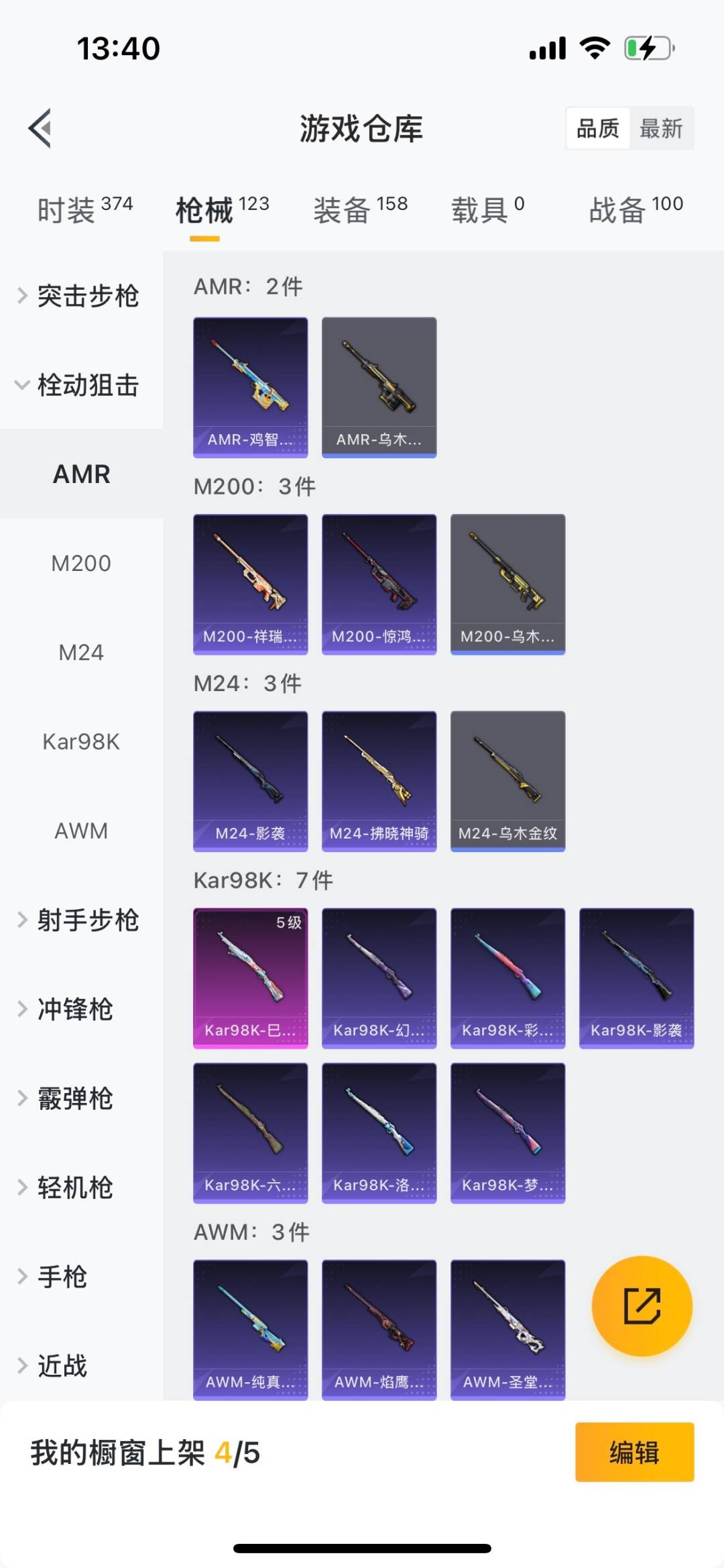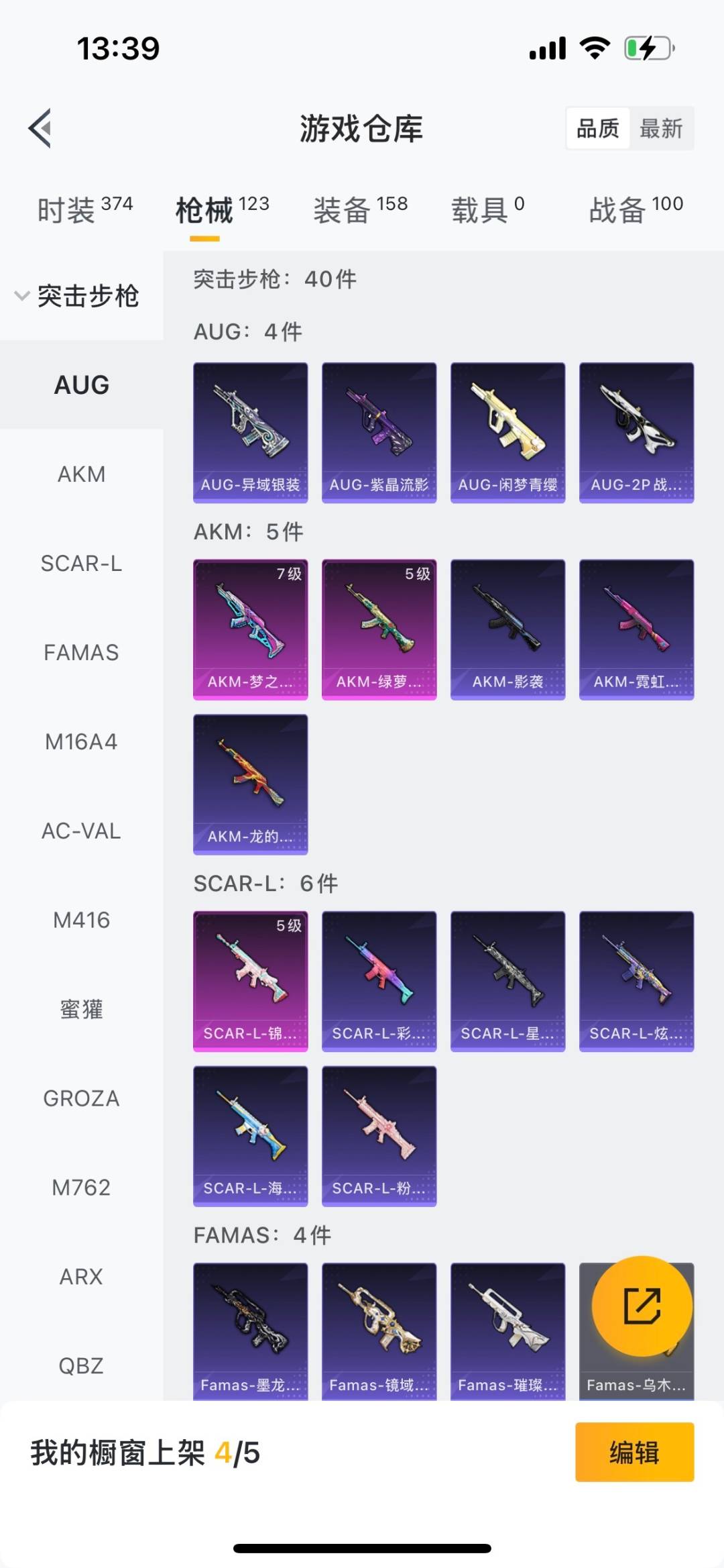 AKM-绿萝繁花,AKM-梦之光华,SCAR-L-锦绣绵绵,M416-电玩时刻,Kar98K-巳巳如意