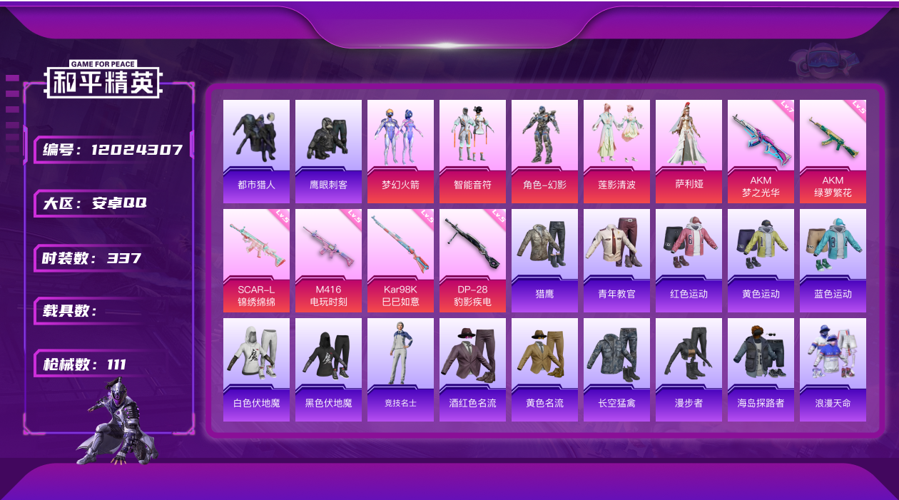 [12024307]5粉装 6特效枪 5印记 可二次 可修改实名 身法装备:都市猎人,暗影哥特(红眼罩),Mark.06(新蓝螳螂) 优质装备:都市猎人,梦幻火箭(新101)(新火箭少女101粉色套装),智能音符,AKM梦之光华,AKM绿萝繁花,SCAR-L-锦绣绵绵,七级AKM-梦之光华,M416电玩时刻,萨利娅,Kar98K-巳巳如意 热门装扮:幻影,莲影清波,鹰眼刺客,都市猎人 稀有枪皮:DP-28-豹影疾电 五级特效枪:五级Kar98K-巳巳如意,五级DP-28-豹影疾电,五级M416-电玩时刻,五级SCAR-L-锦绣绵绵,五级AKM-绿萝繁花 紫色装扮:SS31特训套装,SS33特训套装,青涩时光,千禧之恋,吉莉礼服,夏日音浪,人气偶像,电音精灵,SS19特训,黄色名流,青年教官,魅力单车,黄色运动,黑色伏地魔,龙的传人,龟仙人,冰河战士,龙魂突击队,蝶变,霓虹街区,酒红色名流,长空猛禽,绛羽幽主,深蓝色名流,灰色格斗者,海岛探路者,竞技达人朋克,红色运动,缤纷果语,蓝色运动,猎鹰,甜蜜告白,空岛之星,白色伏地魔,破晓战魂,SS29特训,星途旅人,粉日山川,热情海星,曼妙人鱼,SS28特训,卖崽青蛙,Mark.06(新蓝螳螂),巳巳如意,海琴烟,智谋强哥,异域银装,竞技名士,暗影哥特(红眼罩),纯真浪花,银尘,惊鸿侠骨,SS25特训,金戈铁马,锦衣飞扬,冰公主,SS27特训,焰鹰斗篷,幻羽潜行,幽夜迷踪,浪漫天命,小丑鱼,华灯初上,忠真马岱,忠猛周仓,忠义严颜,晨曦薄雾,SS26特训,春光漫游,快闪甜心,贝斯之夜,大橘大利,SS32特训服(SS32特训套装),绯格组合,漫步者,冰冻风暴 优质战备:圣堂之誓降落伞,精灵梦叶罗丽降落伞,初号机 觉醒Ver.降落伞,金丰海韵降落伞,萌物绒绒飞行器,蜜语绒猫降落伞,猪猪侠降落伞,沙丘之主降落伞,鬼刀降落伞,未来歌姬降落伞,炫光之旅降落伞,梦幻火箭降落伞