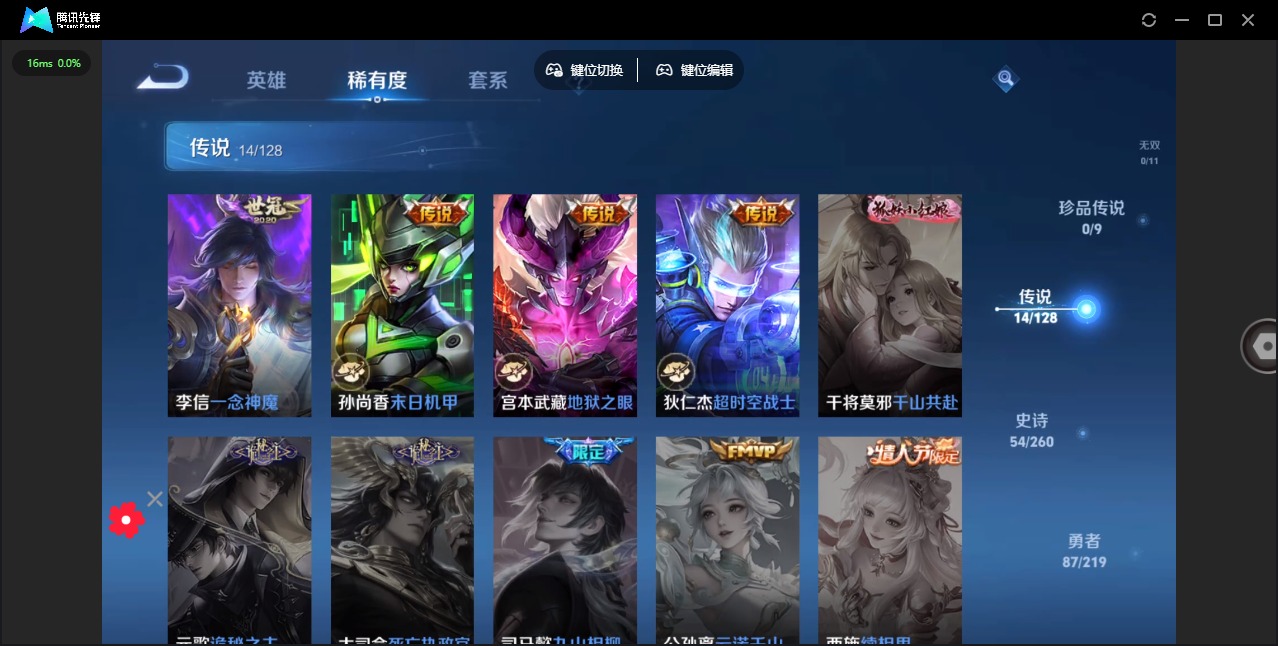 - PX_2097103-95 安卓QQ/至尊星耀/370皮肤/124英雄/2典藏/0珍品无双/1无双/1珍品传说/15传说/113史诗/8稀有英雄 【1 珍品传说】怪盗基德 马可波罗, 【2 典藏皮肤】鸣剑·曳影 李白,星空梦想 鲁班七号, 【1 无双皮肤】器灵·螭龙剑 曜, 【15 传说皮肤】启明星使 虞姬,飞鸢探春 李元芳,白虎志 百里玄策,李逍遥 曜,炽阳神光 镜,霜月吟 露娜,久胜战神 干
