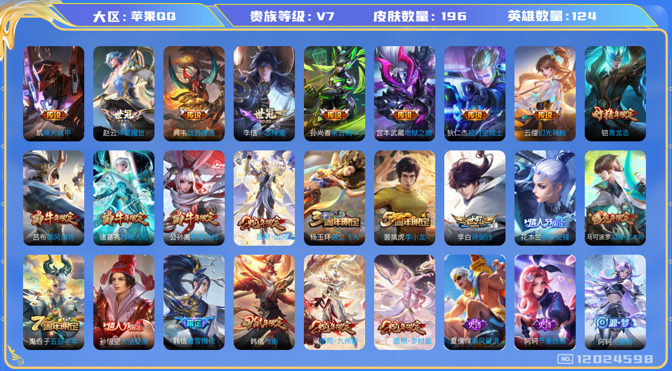 [12024598]V7 14传说 124英雄 196皮肤 可修改实名 优质装备:绛天战甲(鸡嘴战神),一念神魔,末日机甲-孙尚香(绿蚂蚱),地狱之眼,淬星耀世,超时空战士-狄仁杰 传说皮:典韦战鼓燎原,幻光神枪 珍宝阁皮:玩趣恶龙 限定皮:愿照·九州拓(澜年限),愿照·岁时盈(虞姬年限),愿照·山河定(司空震年限),傲雪梅枪,时雨天司(水龙头),飞衡(韩信年限),遇见飞天,诗剑行,五谷丰年,青龙志(铠年限),御风骁将(吕布年限),祈雪灵祝(雪兔子),李小龙,默契交锋-花木兰,大圣娶亲,山海·玄木吟(马可年限) 史诗皮:器灵·浮梦炉,狼魂孤将,绮世丹青,瑰影绮梦,化蝶舞,石田雨龙,蔬乡物语(鲁班七号),白龙吟,千年之狐,永昼,魅语,冰冠公主,偶像歌手,晚萤,电玩·爆裂旋风,百相守梦(刘备),末日机甲-吕布,猫狗日记-孙策,乱世虎臣,节奏热浪,修罗,摇滚巨星,水果甜心,天才门将,星夜王子,暗隐猎兽者,幽灵船长,鬼剑武藏,缤纷独角兽,乘风破浪,逐浪之夏,水晶猎龙者,原初追逐者,圣诞恋歌,鹰眼统帅,魅力维加斯,黎明之约,奇遇舞章
