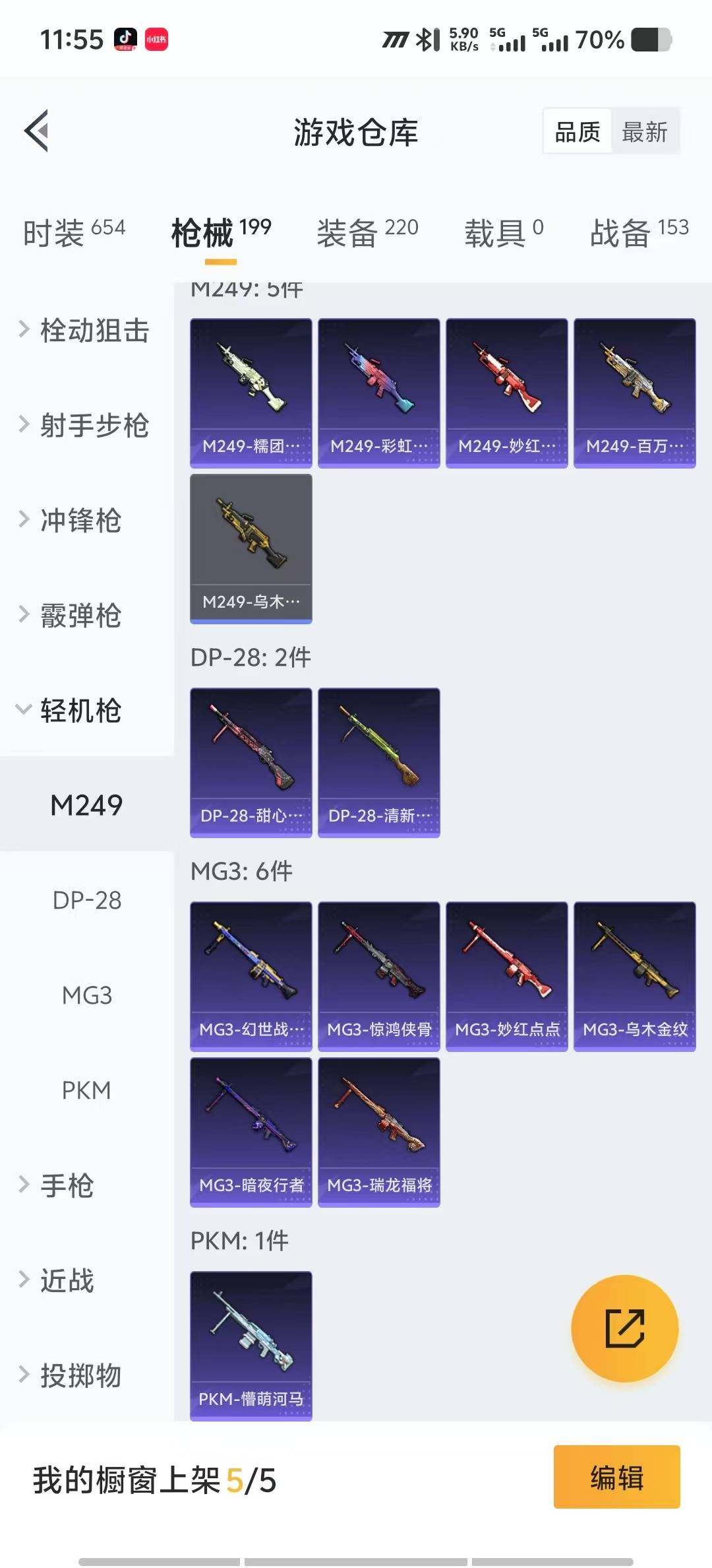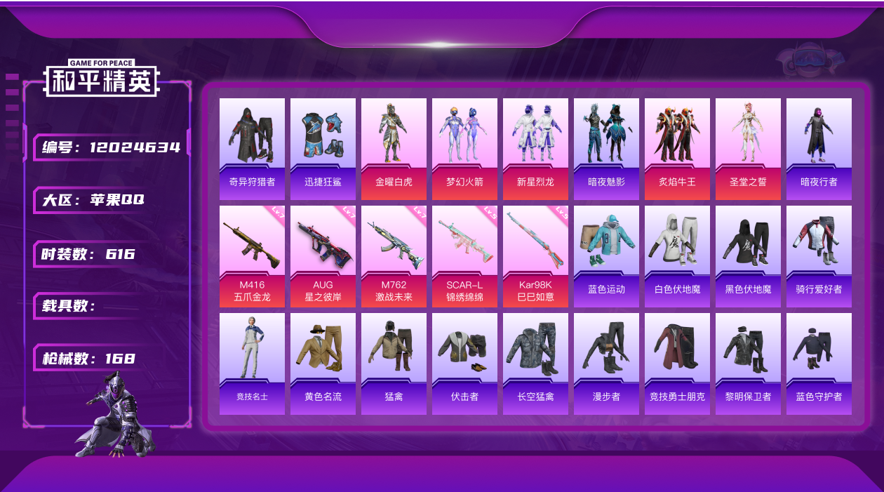 - [6260450]实名: 不可修改 时装数: 301 载具数: 2 枪械数: 102 战备数: 71 热门装扮: 深海小丑鱼,宝贝奶油派,迅捷狂鲨,沙场疾风,碧影闪光,恐龙拽拽,神秘黑猫,兔兔白日梦,音爆索尼克,女娲灵识 载具: 迈凯伦570S(天际蓝),宝马M4(圣保罗黄) 稀有枪皮: AKM炫紫旋律,SCAR-L青春物语,UMP45恐龙拽拽,Kar98K-巳巳如意,M200-伏羲圣卦