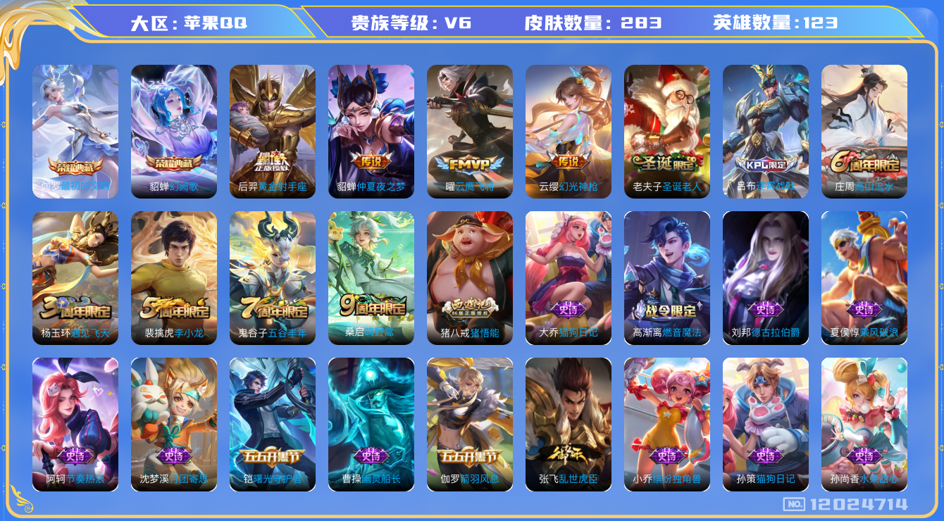 [12024714]V6 2典藏 5传说 123英雄 283皮肤 可修改实名 优质装备:幻阙歌(貂蝉典藏),最初的交响(伽罗典藏),黄金射手座,云鹰飞将(小将军),仲夏夜之梦(大飞蛾) 传说皮:幻光神枪 珍宝阁皮:女武神,玩趣恶龙 限定皮:逐霄战戟,鸣野蒿,遇见飞天,高山流水,五谷丰年,李小龙,圣诞老人,猪悟能 史诗皮:星界战将,破空之剑,蔬乡物语(鲁班七号),电玩小子(小书包),黄金分割率,特工魅影,千年之狐,江河有灵,雪夜绮愿(周瑜),百解令(蒙犽),高渐离燃音魔法,蒙恬荣光圣徽,冰冠公主,偶像歌手,电玩·爆裂旋风,龙骑士(小龙虾),末日机甲-吕布,猫狗日记-孙策,猫狗日记-大乔,乱世虎臣,节奏热浪,摇滚巨星,水果甜心,绅士熊喵,天才门将,星夜王子,心灵骇客,功夫厨神,德古拉伯爵,暗隐猎兽者,幽灵船长,鬼剑武藏,心灵战警,天秀·启明,舞动绿茵,缤纷独角兽,乘风破浪,逐浪之夏,月团寄思,水晶猎龙者,曙光守护者,箭羽风息,金属风暴,原初追逐者,圣诞狂欢,圣诞恋歌,鹰眼统帅,魅力维加斯,黎明之约,无心,未来纪元-赵云,玫瑰异探