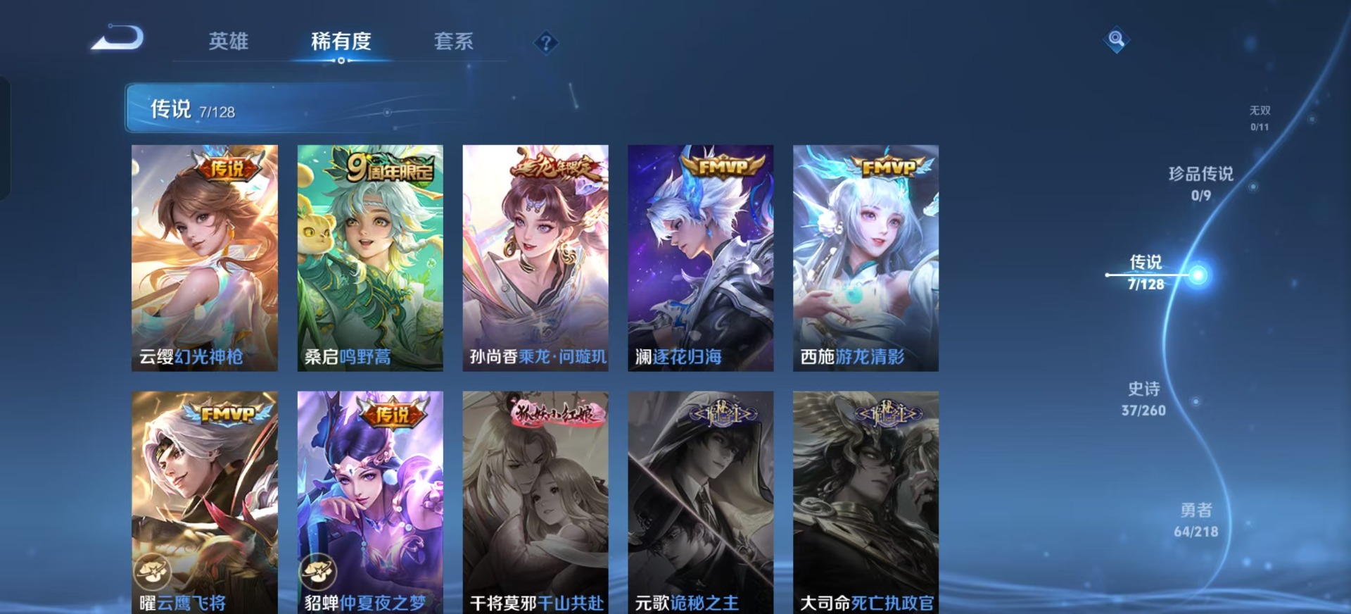 - [11472165]V7 1典藏 7传说 124英雄 316皮肤 可修改实名 荣耀水晶:鸣剑·曳影 传说皮:幻光神枪,地狱火,末日机甲-孙尚香(绿蚂蚱),云霓雀翎,久胜战神 珍宝阁皮:妄想食味,优雅恋人,玩趣恶龙 限定皮:逐霄战戟,鸣野蒿,至尊宝,武陵仙君(小桃花),魔法小厨娘,飞衡(韩信年限),高山流水,五谷丰年,梁祝,李小龙,大圣娶亲 史诗皮:星界战将,灵蛊蚀心,龙之律动,蔬乡物语(鲁班七号),化蝶舞,紫霞仙子,苍穹之光,电玩小子(小书包),白龙吟,黄金分割率,特工魅影,千年之狐,江河有灵,高渐离燃音魔法,雪夜绮愿(周瑜),百解令(蒙犽),蒙恬荣光圣徽,冰冠公主,偶像歌手,无限星赏官,电玩·爆裂旋风,暗夜猫娘,龙骑士(小龙虾),末日机甲-吕布,猫狗日记-孙策,猫狗日记-大乔,乱世虎臣,节奏热浪,女仆咖啡,摇滚巨星,水果甜心,绅士熊喵,天才门将,星夜王子,心灵骇客,功夫厨神,德古拉伯爵,暗隐猎兽者,幽灵船长,鬼剑武藏,心灵战警,舞动绿茵,地狱岩魂,诗语江南,纤云弄巧,繁星吟游(呼啦呼啦),拒霜思,缤纷独角兽,乘风破浪,逐浪之夏,月团寄思,水晶猎龙者,曙光守护者,箭羽风息,唤灵魅影,金属风暴,原初追逐者,圣诞狂欢,圣诞恋歌,鹰眼统帅,王者之锤,暗夜贵公子,魅力维加斯,黎明之约,无心,未来纪元-赵云